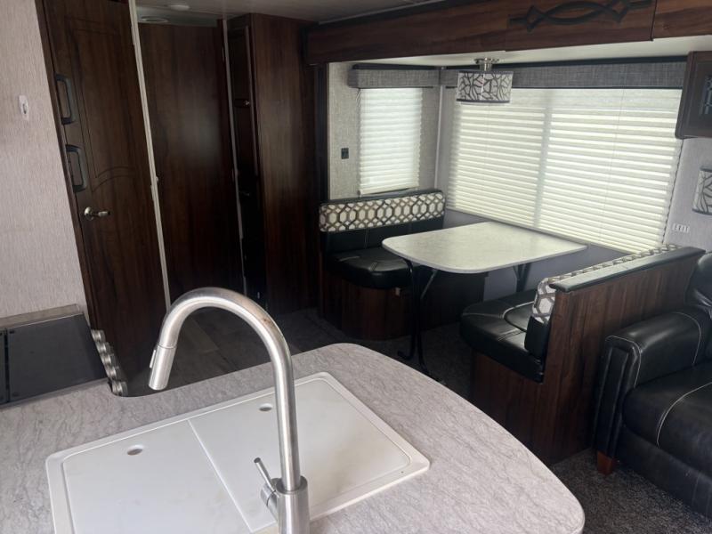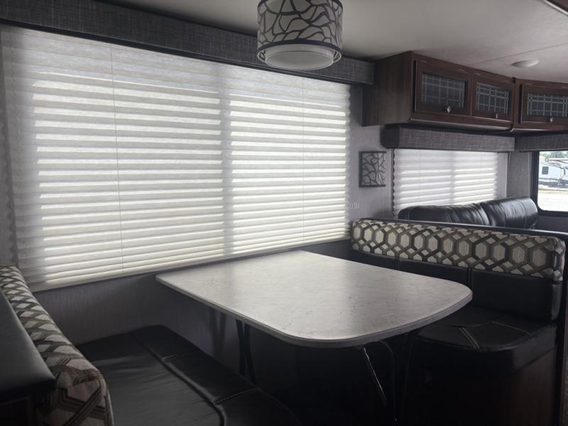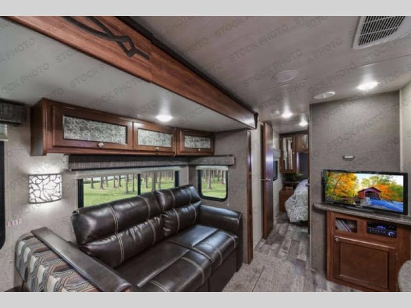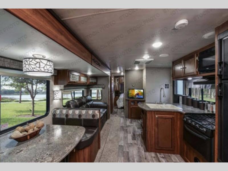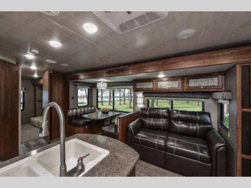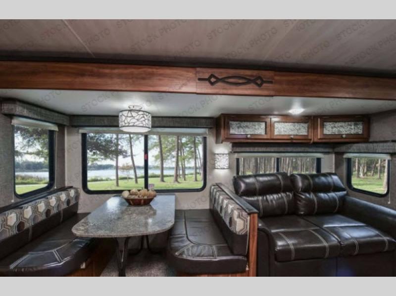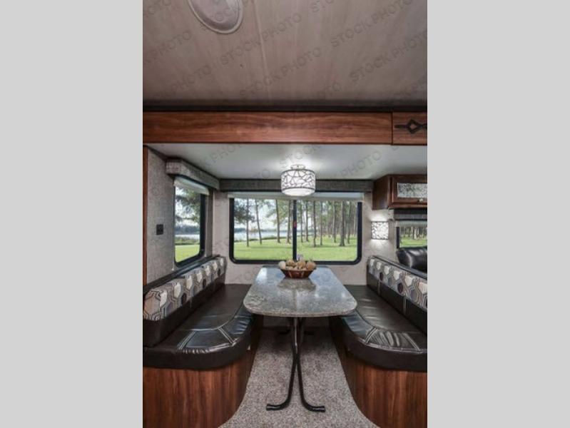 Opposite the kitchen enjoy seating at either the booth dinette or sofa which features overhead storage. Both are found within a nice slide out which also provides added walking around space inside, and each can double as sleeping space if needed at night for family or friends.