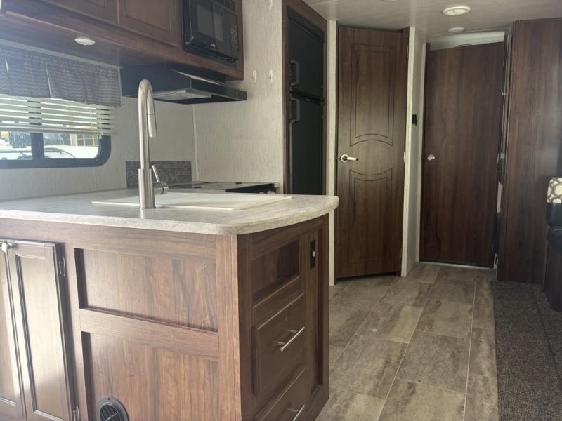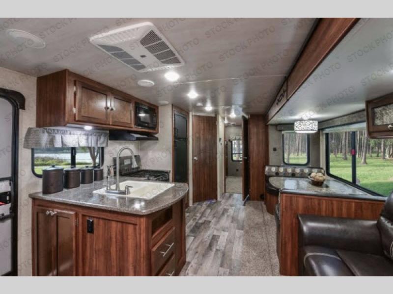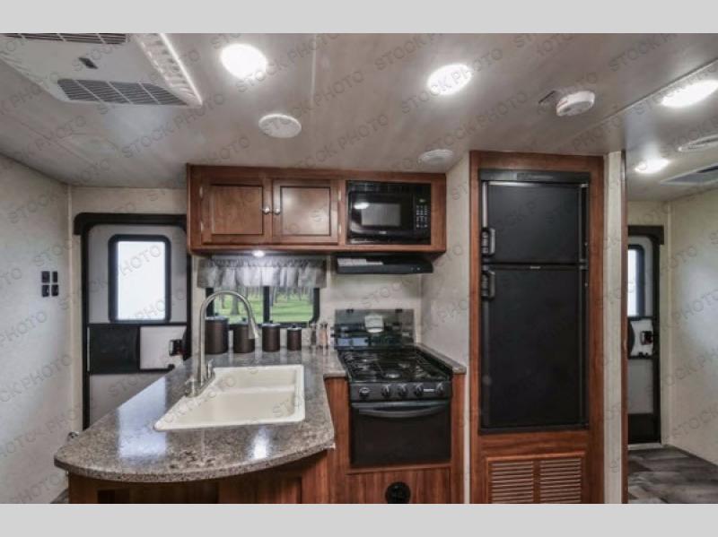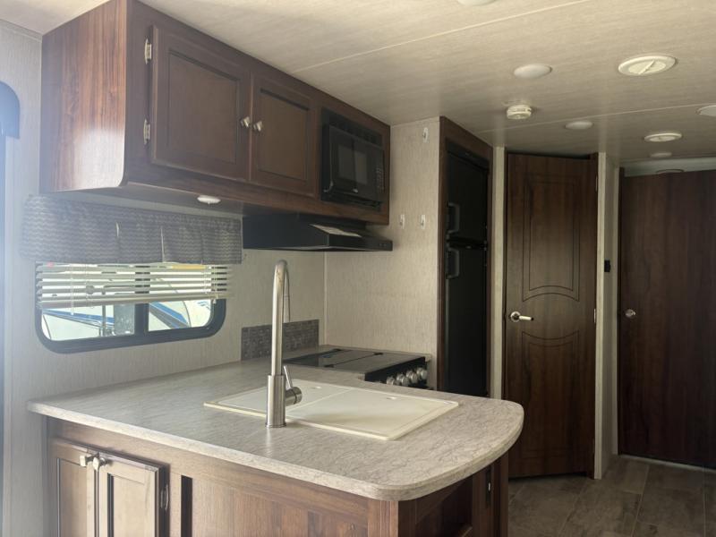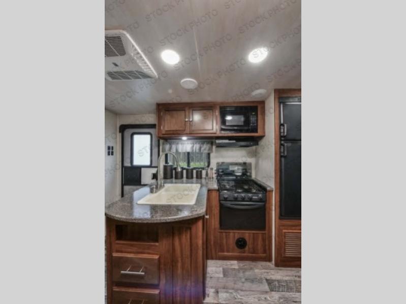 On the outside of this unit notice the handy kitchen beneath the curbside bunk to the left of the half bath entry. Here you will find a sink, refrigerator, a bit of storage, and a flat screen TV option, plus so much more!