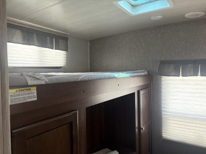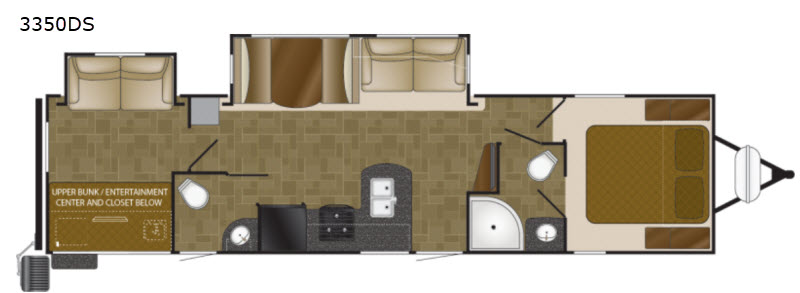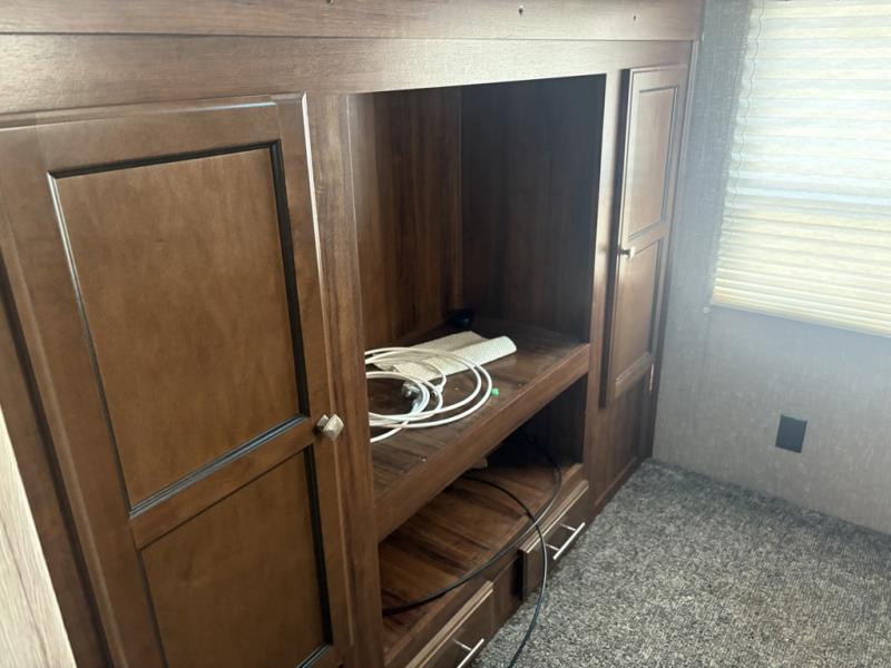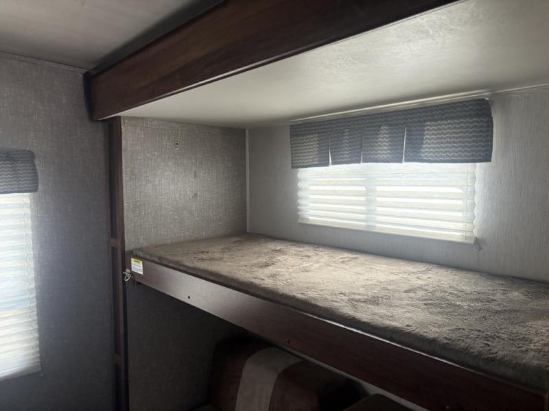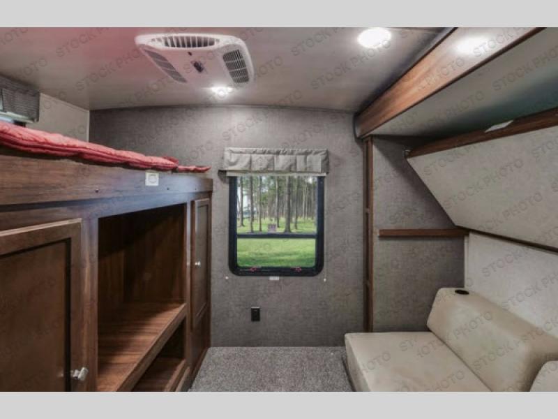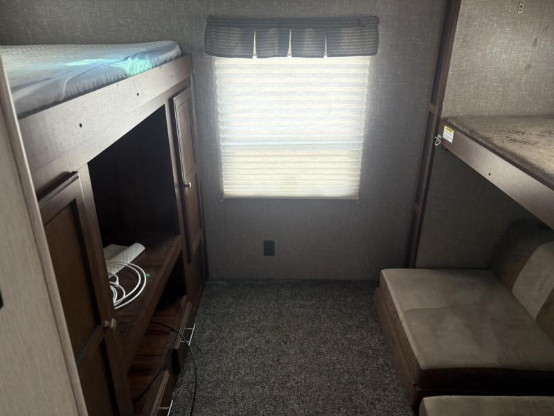 The rear bunkhouse features a slide out along the roadside that provides seating beneath a top bunk. Both provide sleeping space for one. Opposite the slide you have an entertainment center and closet beneath an upper bunk. This space is sure to be a favorite place for your kids to want to hang out when inside.