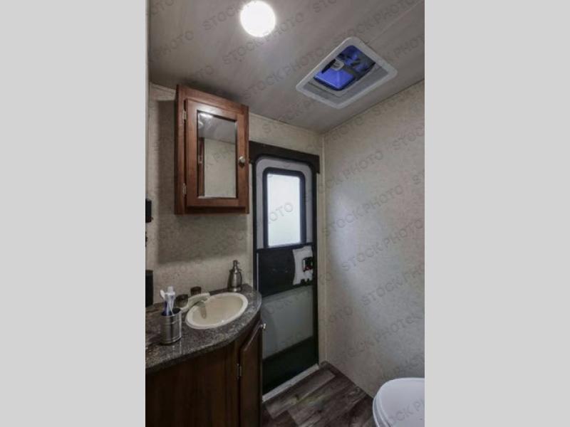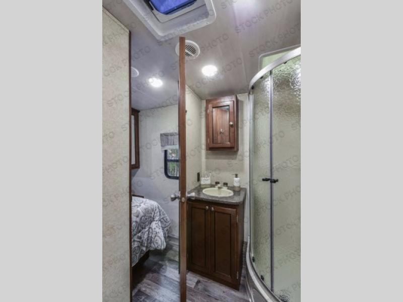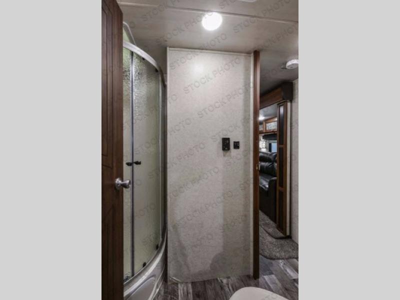 To the right of that same entry door you will find a corner entertainment center and the door to the full on-board bath. This bathroom features a radius shower, a toilet, and a vanity with sink. There is also a second entry door in this bath that leads into the front master bedroom.