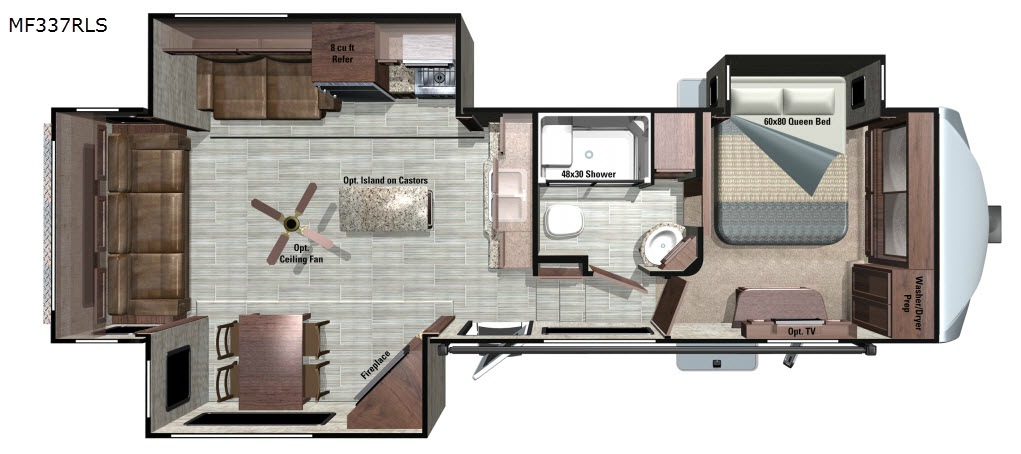 Triple slides and a rear living layout are featured in this Mesa Ridge fifth wheel model MF337RLS by Highland Ridge RV.