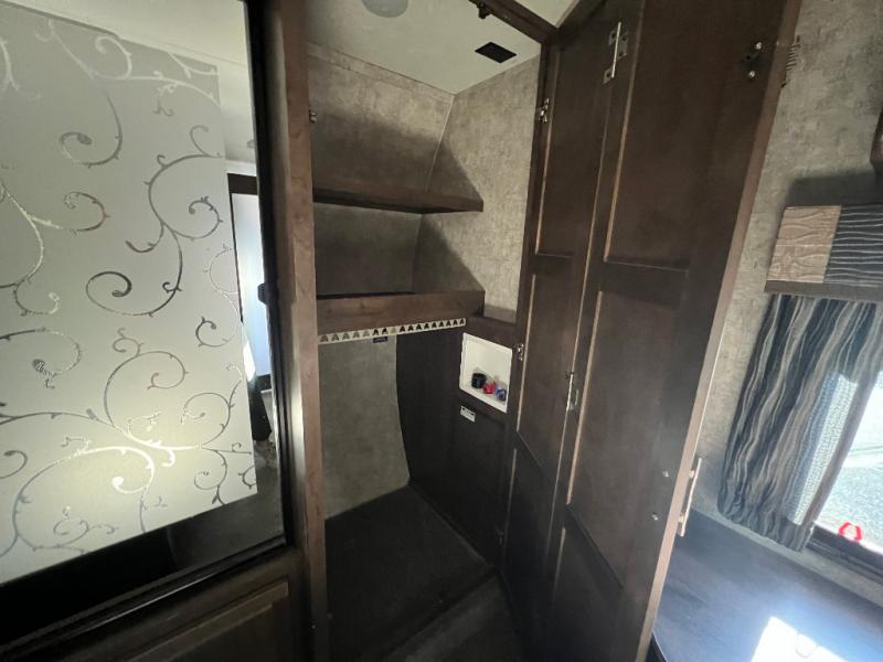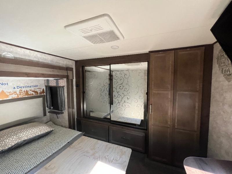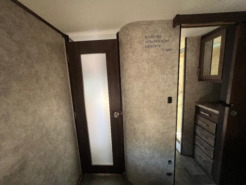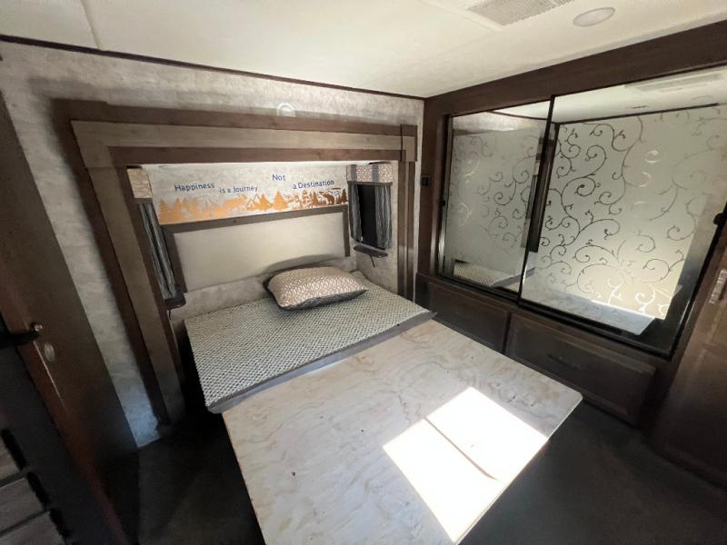In the private bedroom find a queen bed slide out, chest of drawers opposite, and a mirrored door wardrobe with sliding doors, plus a storage closet that has been prepped for a washer and dryer, and so much more!