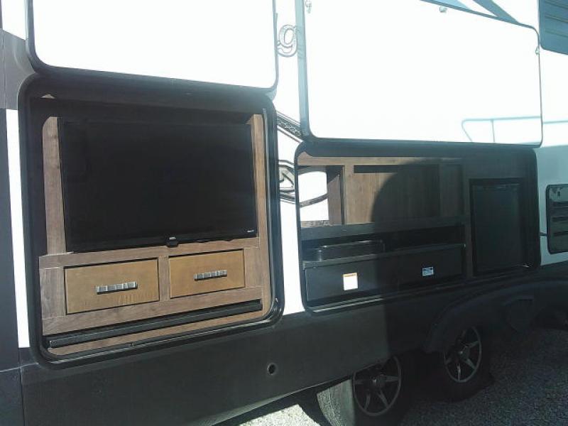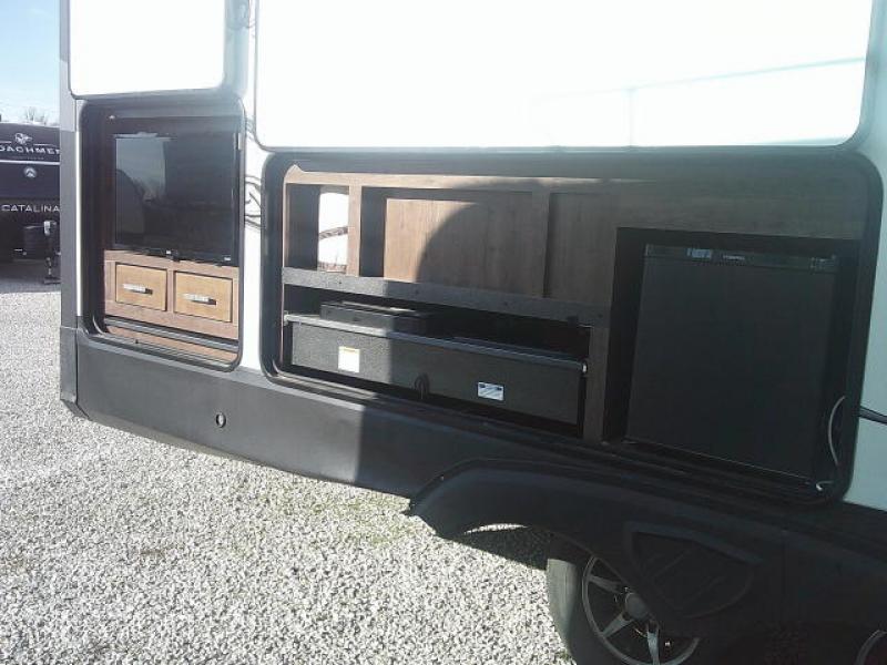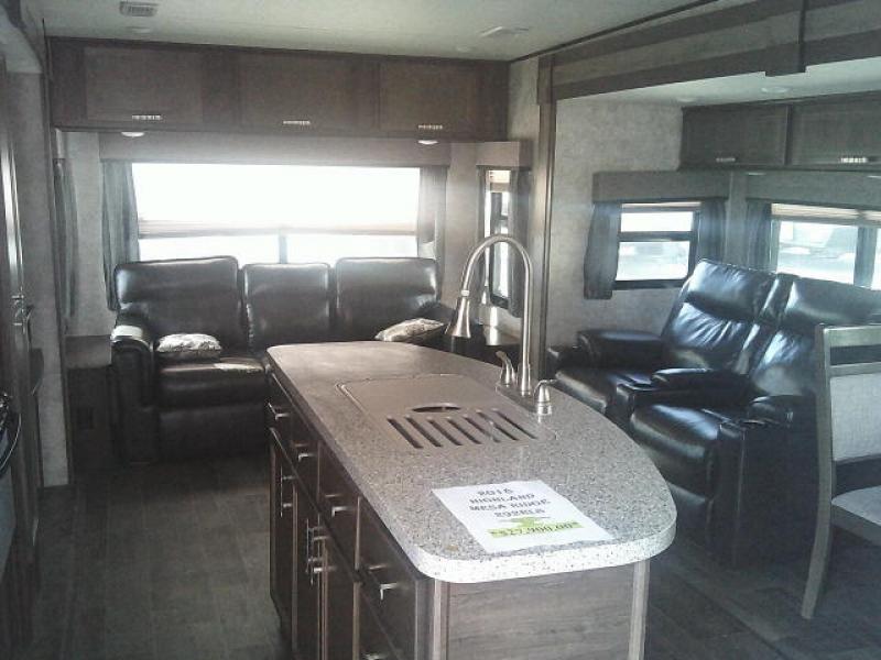 This Mesa Ridge travel trailer by Highland Ridge RV offers spacious camping featuring a rear living layout, triple slides for added walking around space, a convenient kitchen island, and an outdoor kitchen too!