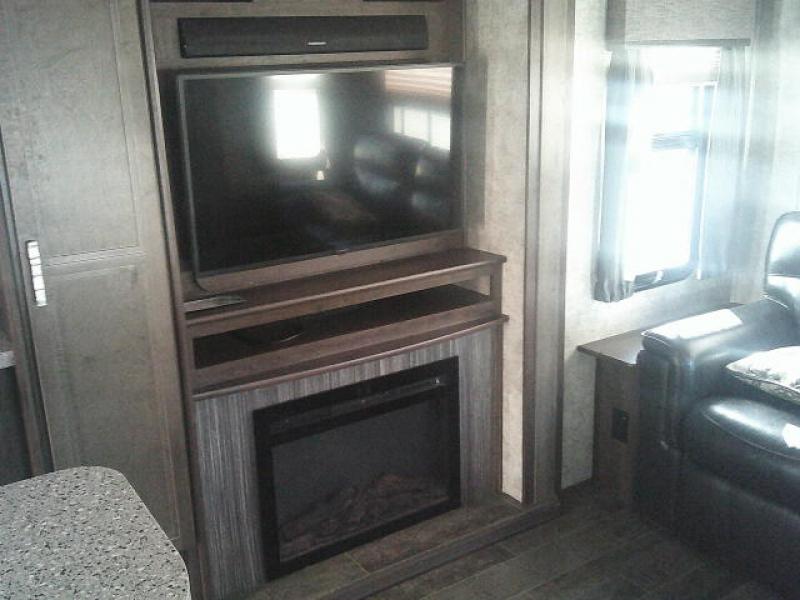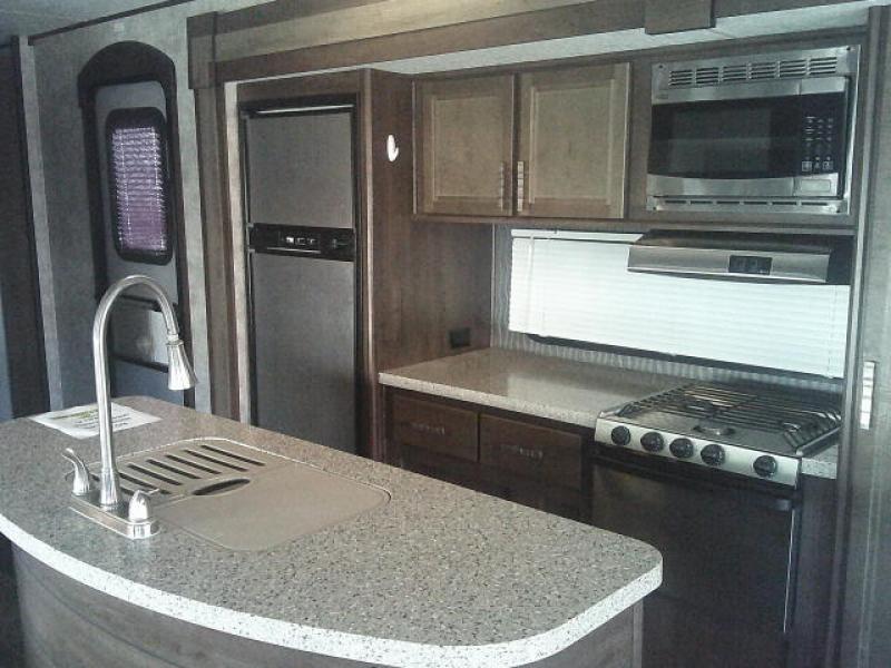 To the left of the entry find the kitchen where you can enjoy cooking for your family. There is a slide out refrigerator, three burner range with overhead microwave oven, and pantry for your non-perishables. The kitchen island has a double sink, plus added counter space for food prep and more. The kitchen slide also features an entertainment center and fireplace.