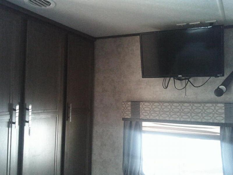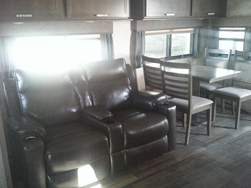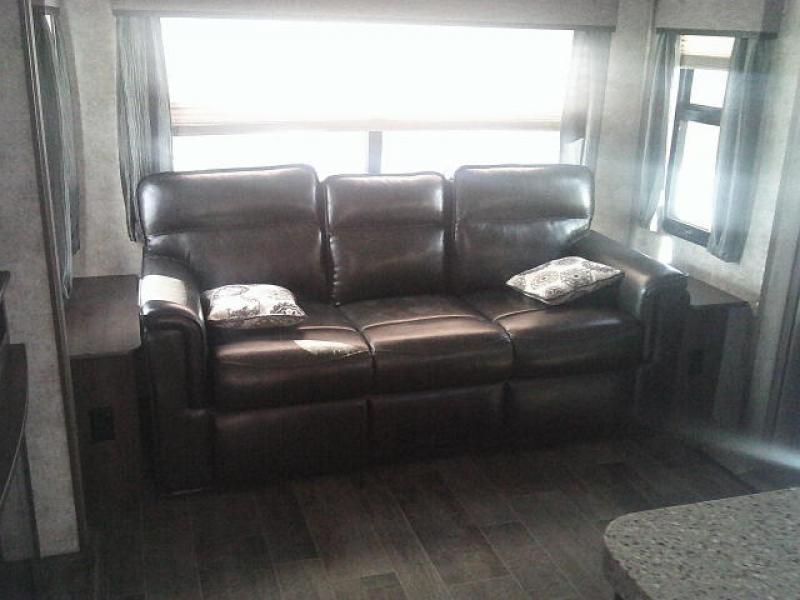 The slide opposite the door side features a dining table with four chairs, and theater seating for two with cup holders and overhead storage. Along the rear wall find a sofa with end tables and storage above that stretches across the rear wall.