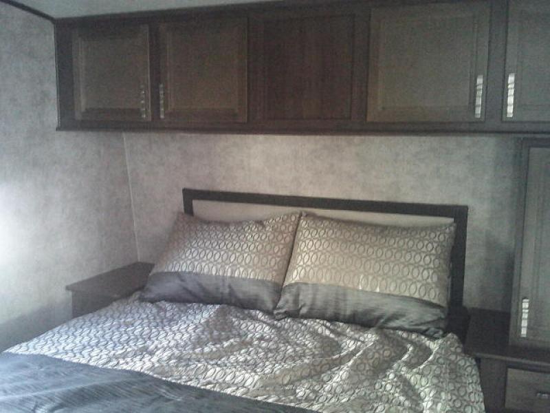 In front enjoy a relaxing space to catch a great night's sleep on a queen size bed with dual nightstands and overhead storage, and a slide out wardrobe along the curb side, plus an additional smaller wardrobe along the inside wall. At the foot of the bed there is additional storage cabinets and drawers.