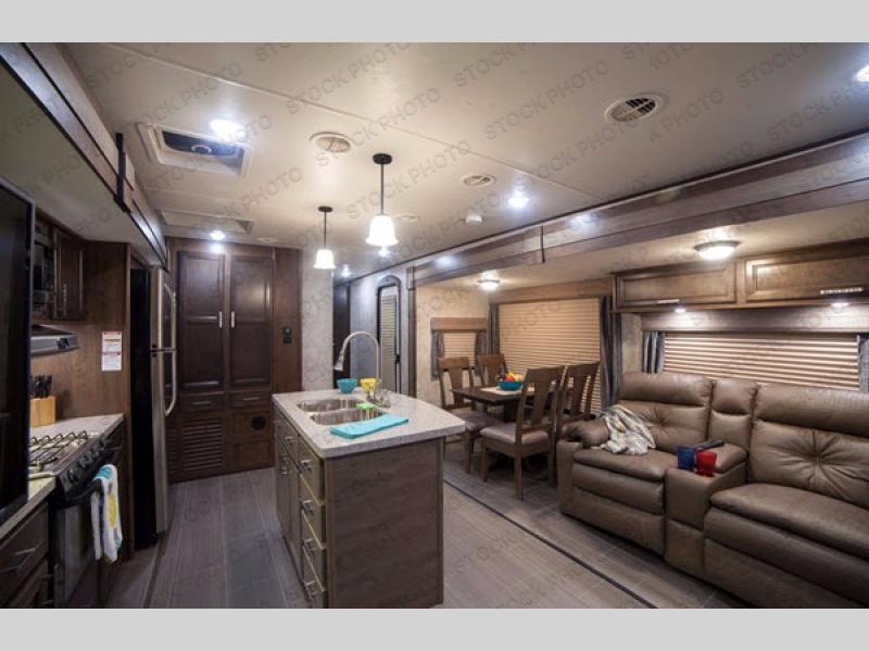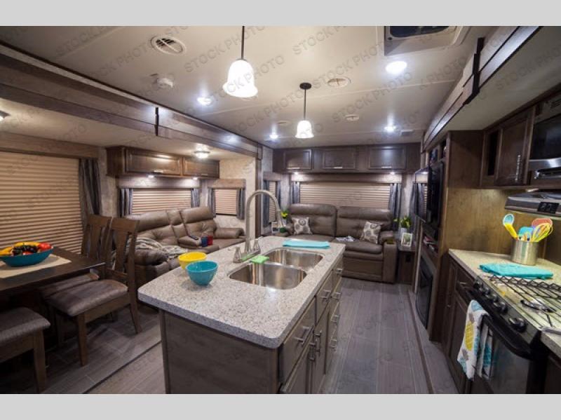 Enter and step into the main combined kitchen and living space to your immediate left. Here you will find a dinette with four chairs and theater seating for two in a slide out just inside the door. Along the rear wall there is a tri-fold sofa with queen bed and end tables, plus overhead storage the entire width of the unit. There is also storage above the theater seating along the curb side wall as well.