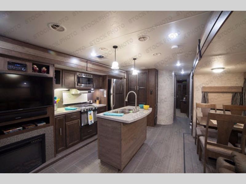 This Mesa Ridge travel trailer model MR323RLS features plenty of room inside with triple slide outs, a convenient kitchen island, and even a fireplace for those cool chilly nights!