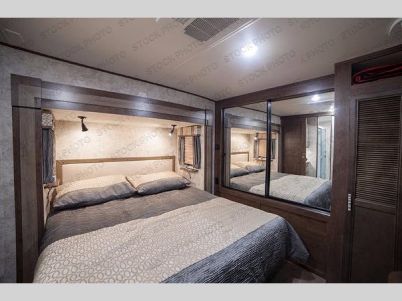 Inside the bedroom you will enjoy a spacious layout due to the queen slide out bed with a dresser opposite along the curb side wall. The front features a full wall wardrobe with sliding doors, plus a washer and dryer prepped closet for added storage if you choose not to add units, and so much more!