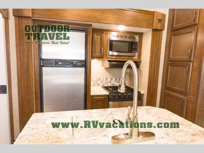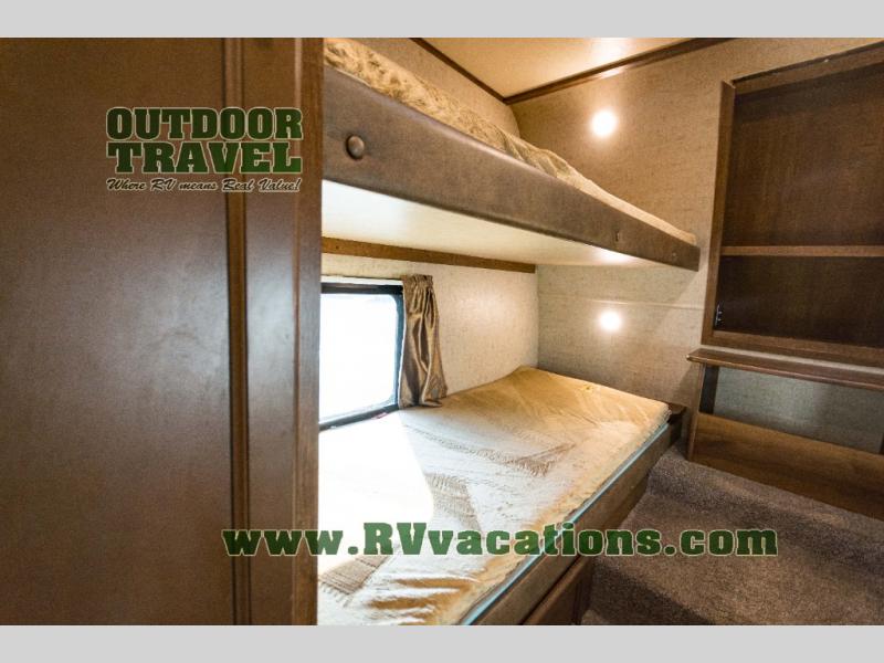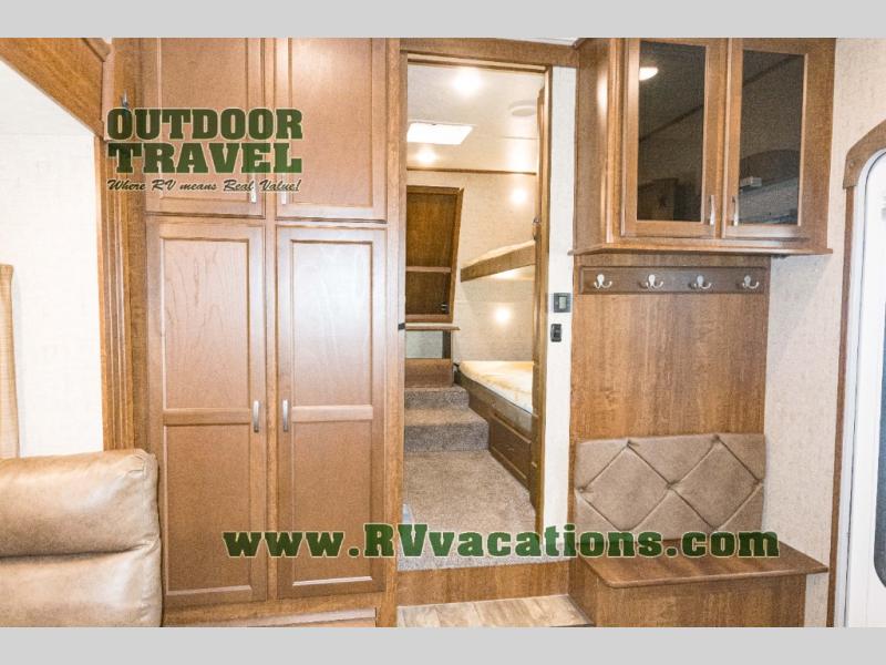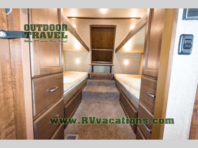 In the front of the fifth wheel you will find a private bunkhouse with two sets of bunk beds allowing for sleeping space for four, cabinets and drawers on each side, and a location for an optional TV up front, plus so much more inside and outside!