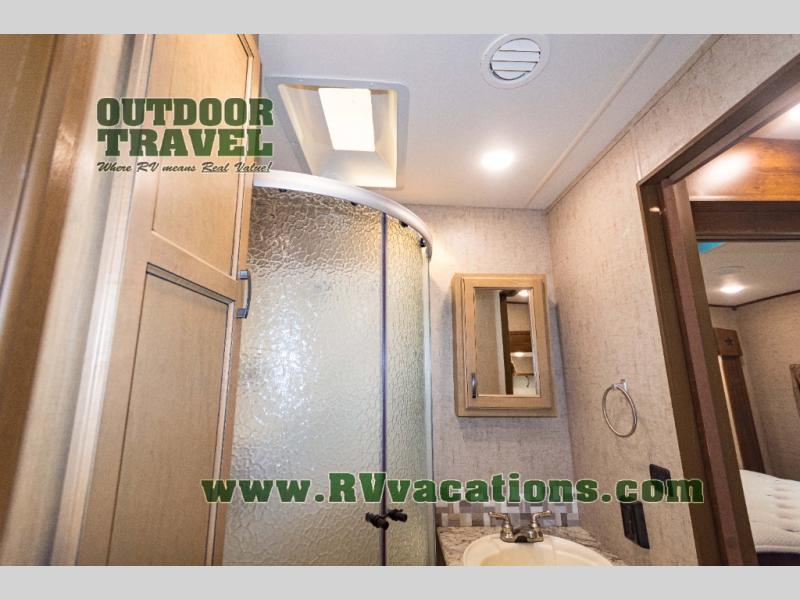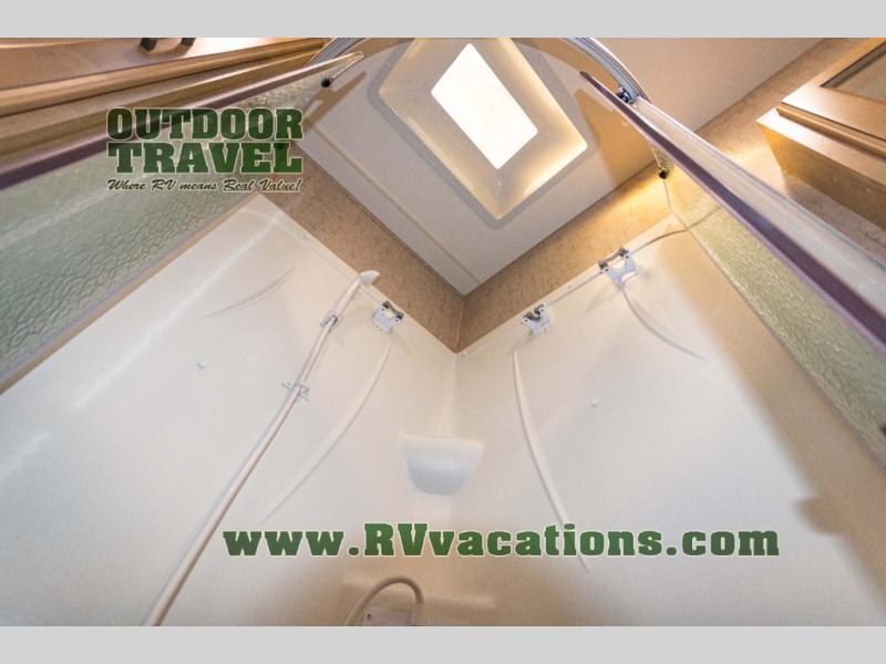 The complete bath features a toilet, sink, linen cabinet, and radius shower. There is also a second entry door that leads directly into the rear master bedroom where you will find a wardrobe with storage drawers below, and a queen bed slide.