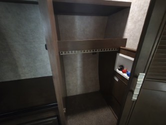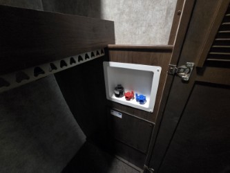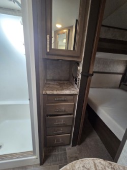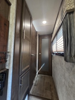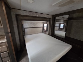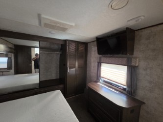 In the private bedroom find a queen bed slide out, chest of drawers opposite, and a mirrored door wardrobe with sliding doors, plus a storage closet that has been prepped for a washer and dryer, and so much more!