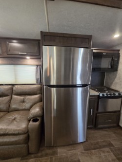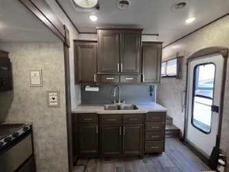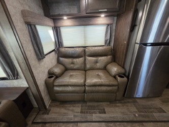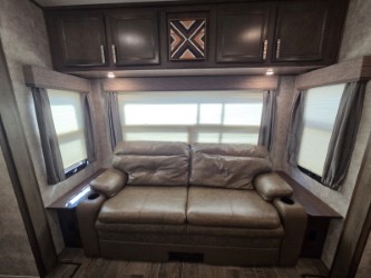 The combined kitchen and living space provide a sofa along the rear wall and include overhead cabinets for storage the entire width of the fifth wheel.