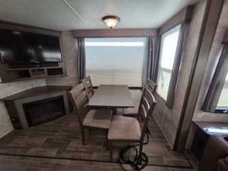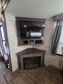 Inside the slide closest to the door there is a dinette table with four chairs plus a corner entertainment center with fireplace below. Opposite you will find a slide out sofa with overhead cabinets, a refrigerator, and three burner range with microwave oven.