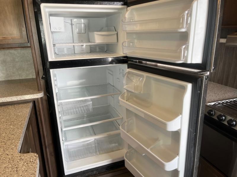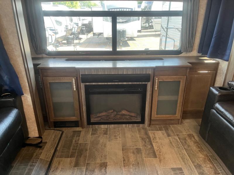 The slide out on the road side features a refrigerator or you can choose an optional 18 cu. ft. residential refrigerator, L-shaped counter with a double sink, and a L-shaped sofa with overhead cabinets. Along the rear wall you can enjoy the entertainment center and TV. There is also a fireplace which will come in handy on those chilly evenings, plus more!