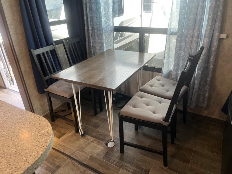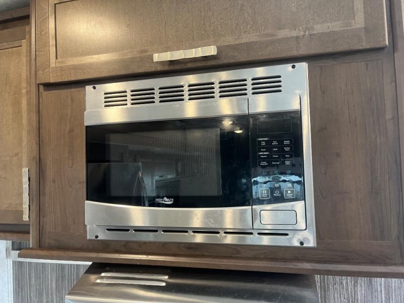 In the combined kitchen and living area there are dual opposing slide outs with the first slide featuring a free standing table with four chairs, and theater seats for two with cup holders. Along the interior wall there is a three burner range and microwave above where you can fix you favorite meals. There are overhead cabinets, and extra counter space as well.