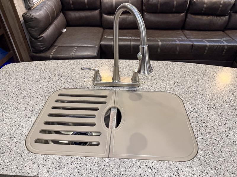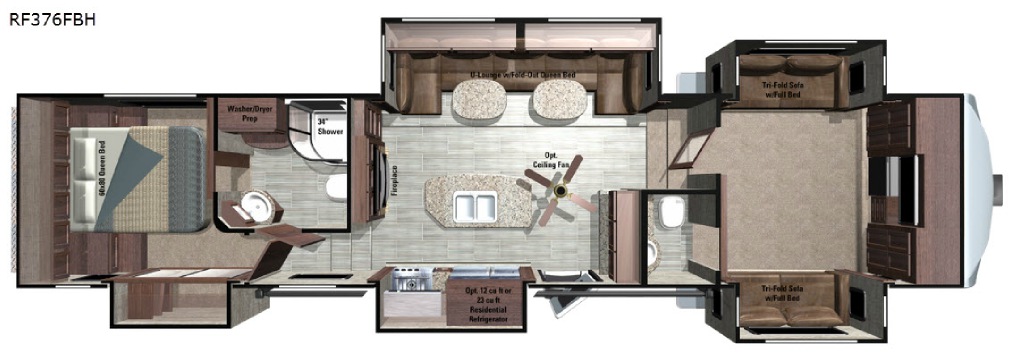 Step inside model RF376FBH and find yourself in the kitchen and living area. There is a counter to your right with overhead cabinets. A convenient place to drop off groceries when coming inside. The off set island also provides added counter space, plus it features a double kitchen sink.