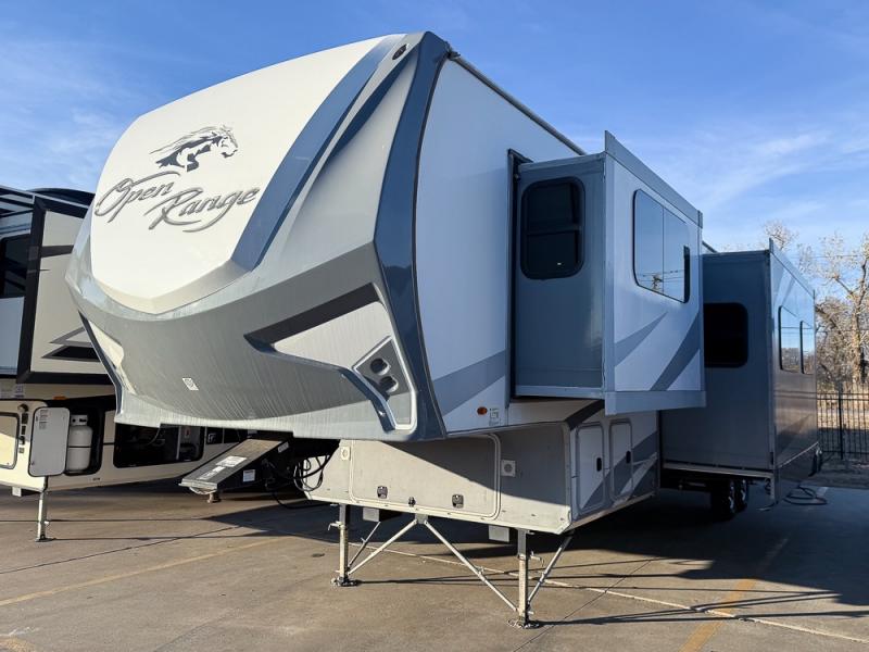 Enjoy the spaciousness of this Open Range Roamer fifth wheel by Highland Ridge RV featuring FIVE slides for more interior space, a front wall entertainment center and living space, plus a bath and a half. You and your family will find all the accommodations needed to make any camping trip enjoyable.