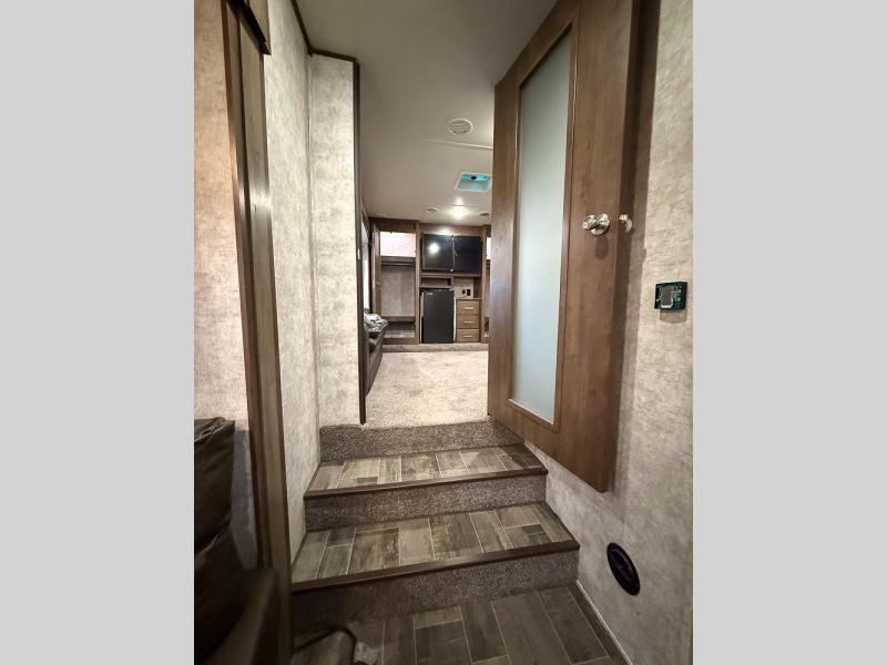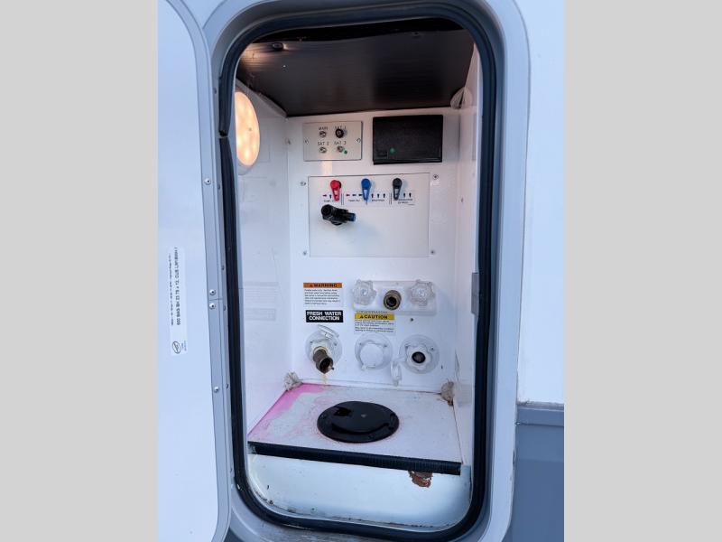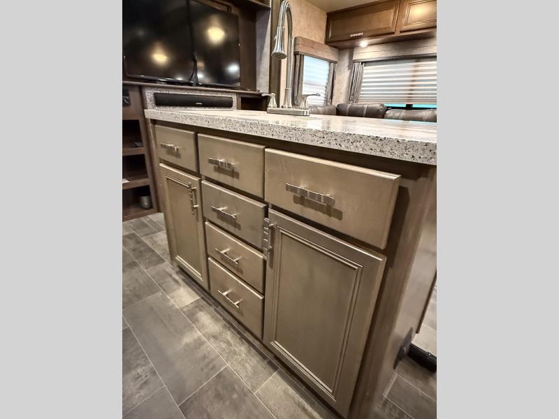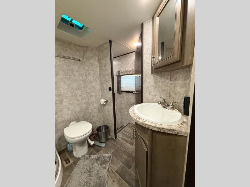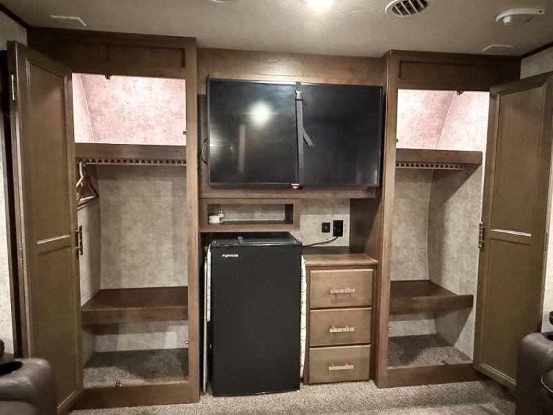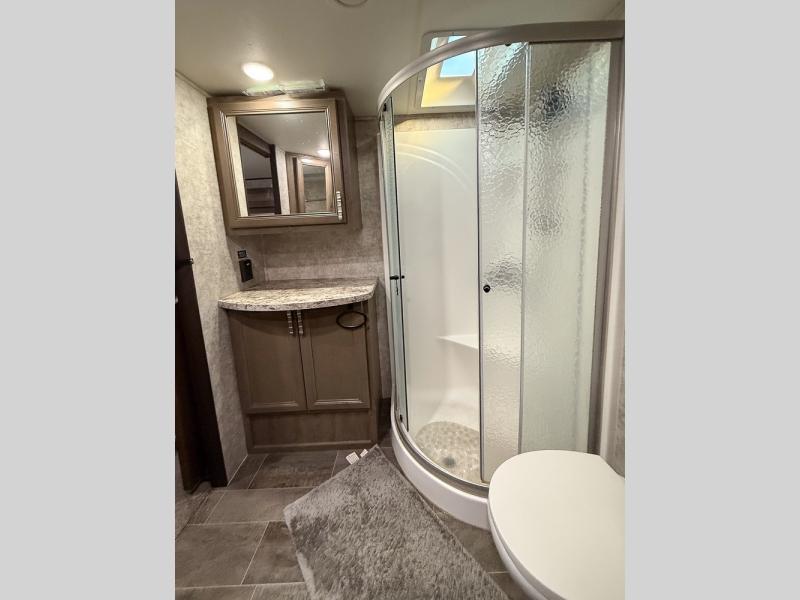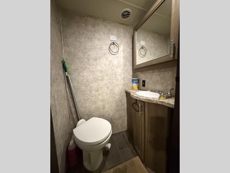 Head up the steps to find a wide open living space to enjoy featuring dual sofas that both slide out. There is also storage along the front wall which includes an entertainment center, and a TV. You will also enjoy a half bath off the curb side slide featuring a vanity with sink and toilet, plus overhead storage.
