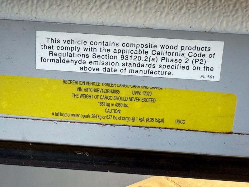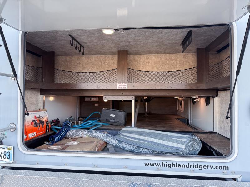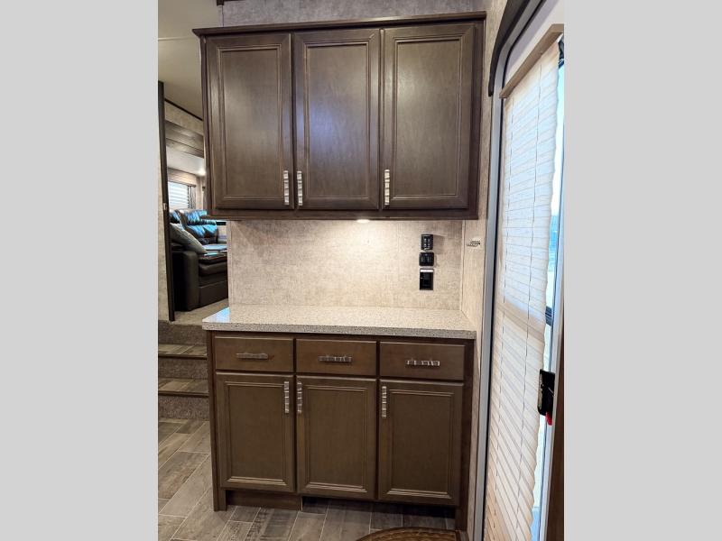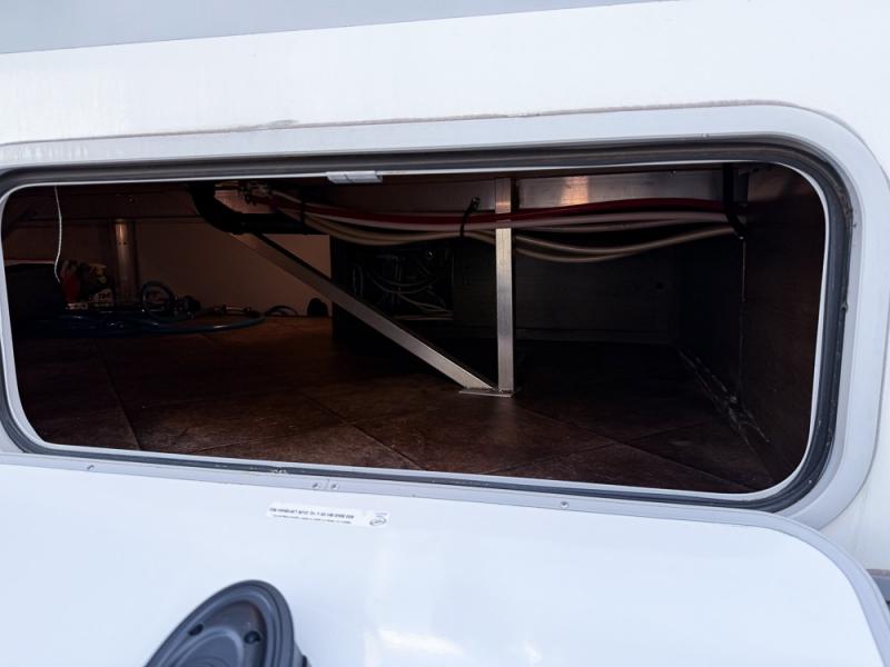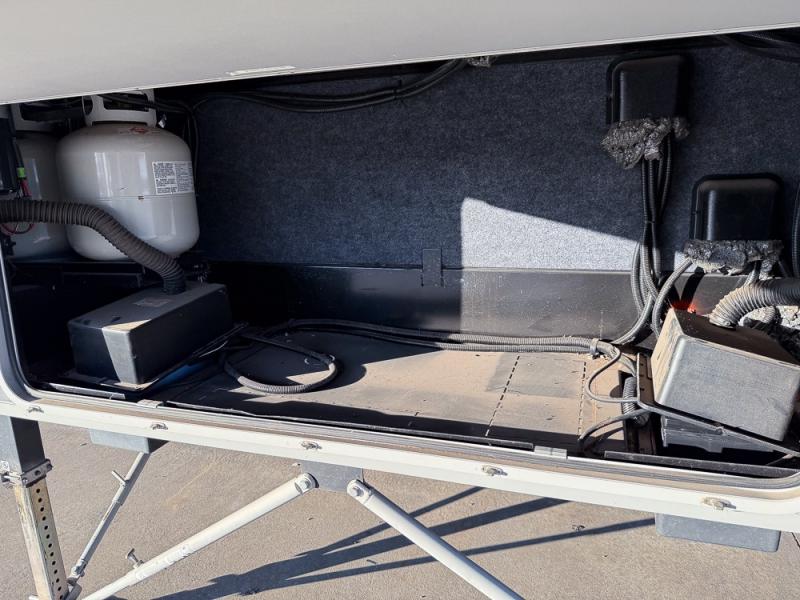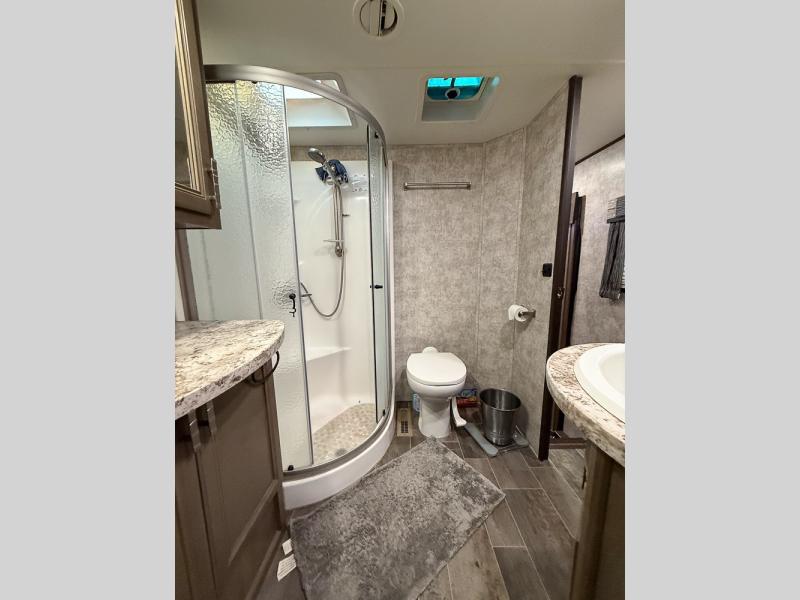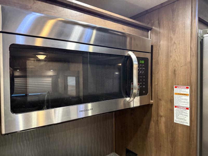 Head up the steps to find a wide open living space to enjoy featuring dual sofas that both slide out. There is also storage along the front wall which includes an entertainment center, and a TV. You will also enjoy a half bath off the curb side slide featuring a vanity with sink and toilet, plus overhead storage.