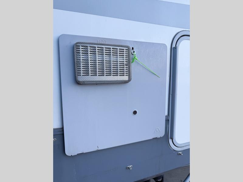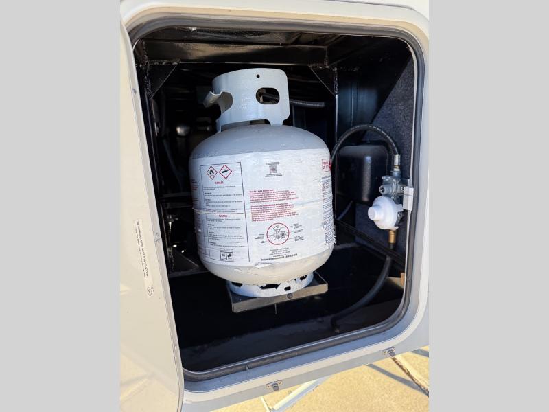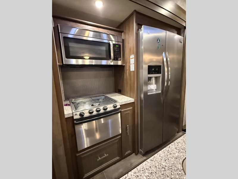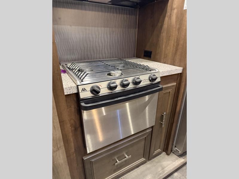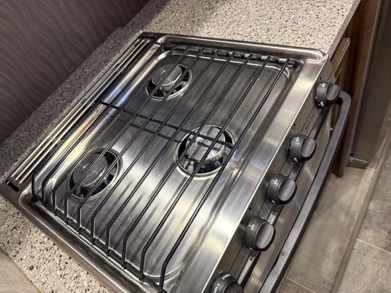 To the left of the main entry door find the kitchen refrigerator and three burner range slide out. There is also an overhead microwave oven, and you can choose to add a larger 12 cu. ft. refrigerator or 23 cu. ft. residential model.