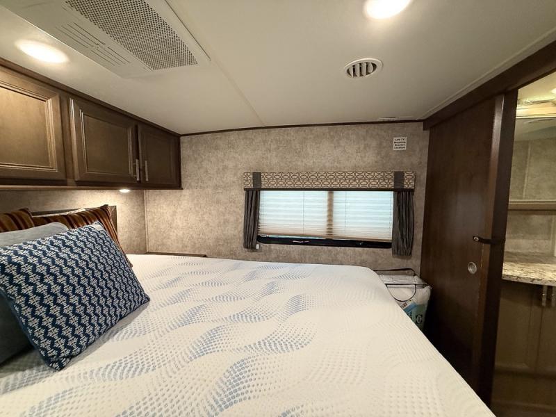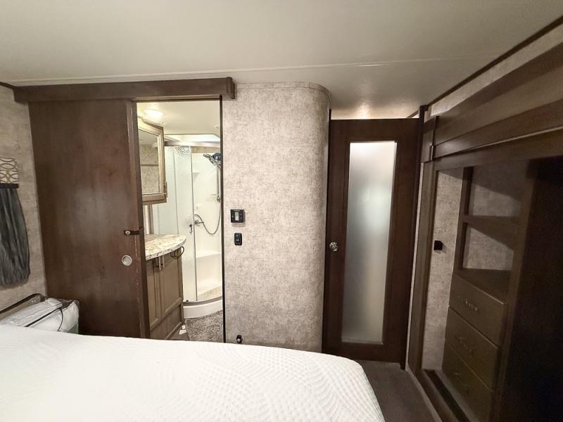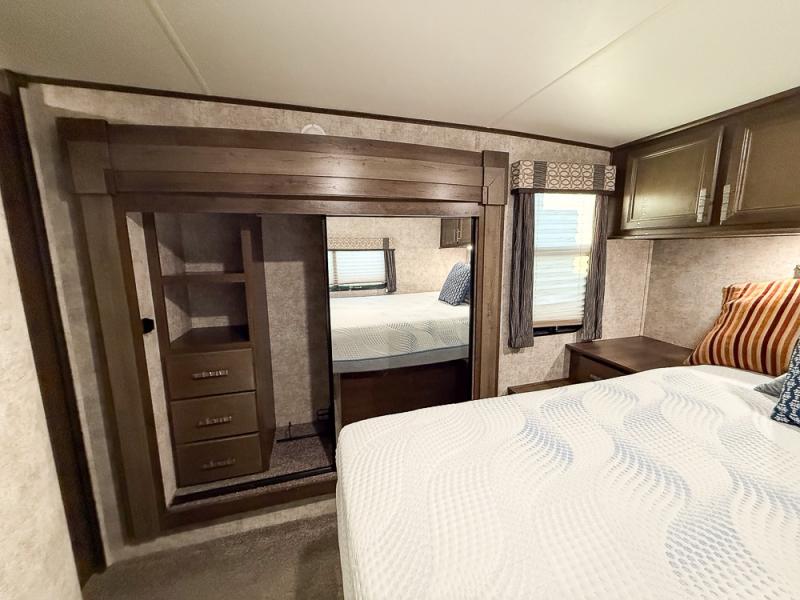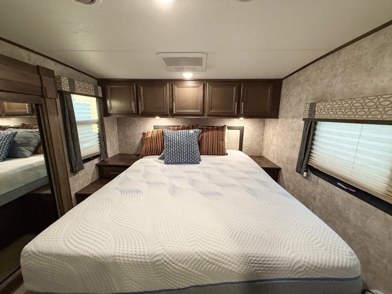 Once inside the rear master bedroom notice the foot traffic space that you have due to the wardrobe slide. Enjoy sleeping on the queen size bed with dual nightstands, plus overhead storage, and so much more!