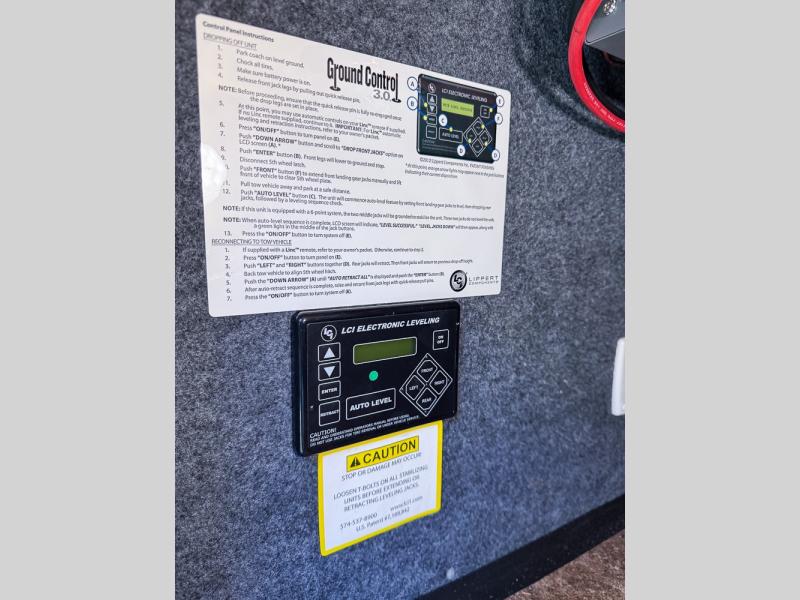Straight ahead find another large slide out including a U-shaped lounge with fold out queen bed, and two dining tables, plus overhead storage. A nearby entertainment center and fireplace is easy to view from anywhere in the room.