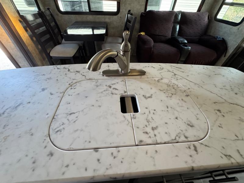 Head back and down the steps to find a curbside slide out featuring a booth dinette and theater seats. On the opposite side the second slide in this area includes an entertainment center, a three burner range, microwave, and a refrigerator. A large pantry and additional storage can be found along the interior wall. The chef in the family will enjoy the extra prep space on the kitchen island, and the double sink for easy clean up. Along the rear wall you can relax on the sofa that also provides additional sleeping space at night like the dinette. This combined area provides plenty of room to invite over your friends and family on any trip.