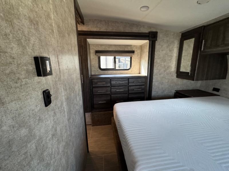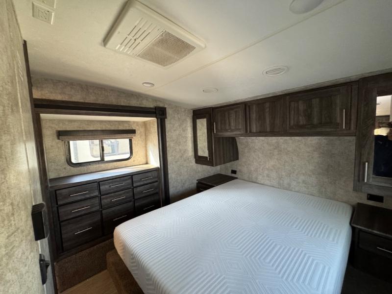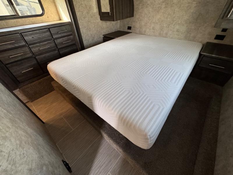 The front bedroom provides a restful night's sleep on a queen bed with dual nightstands along the front wall. You can store your clothes in the bedside wardrobes, overhead storage, or within the bedroom slide out. The slide includes a wardrobe as well as the linen storage mentioned above in the bathroom.