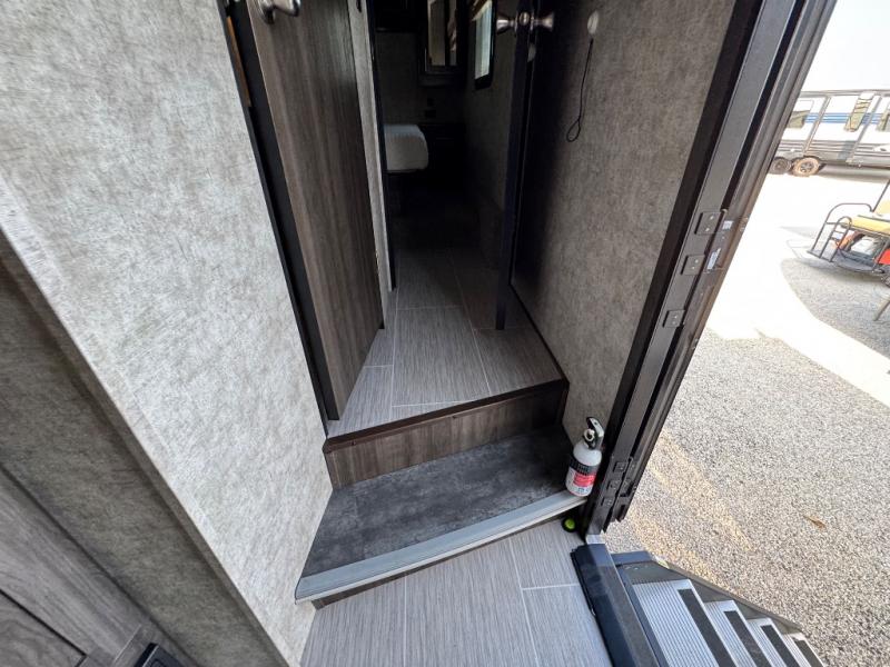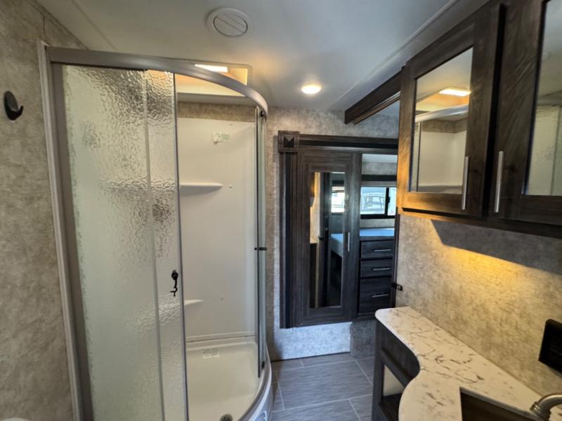 Step inside UF2910RL to see a side aisle bath and front bedroom to your right, and the main living and kitchen area to your left. The bath includes a radius shower, vanity with sink and medicine cabinet, toilet, and linen storage, plus a second entrance from the bedroom.