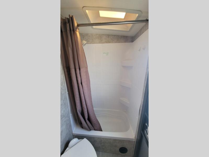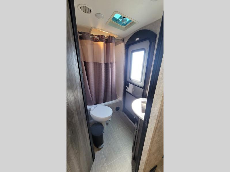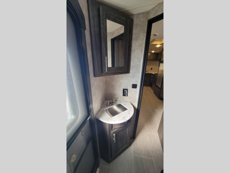 The rear right corner features a convenient bathroom with a private entry from the outside along the roadside. This is great when spending time outdoors giving you easy access when you need it. The bath includes a shower, toilet, and vanity with sink.