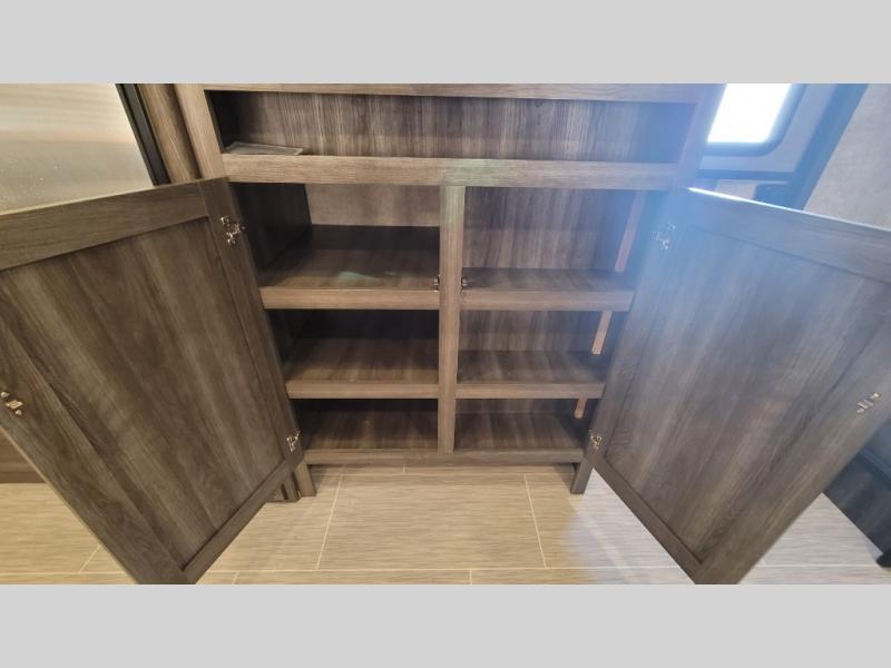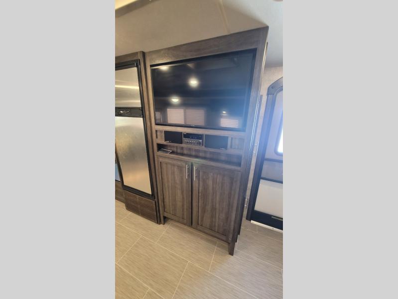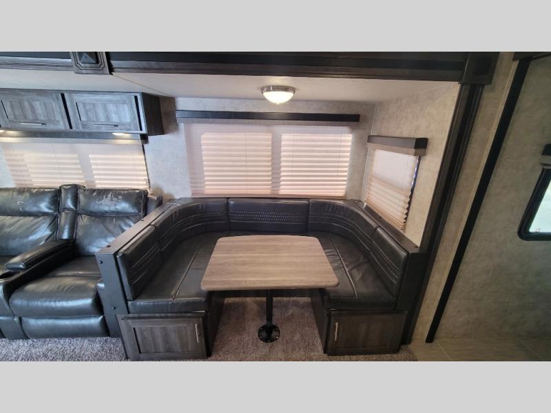 Along the roadside wall the large slide out features theater seats and u-shaped dinette for plenty of seating while eating and visiting as well as sleeping space at night.