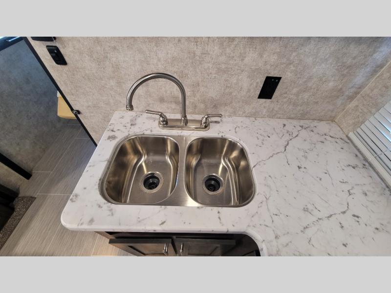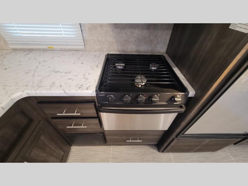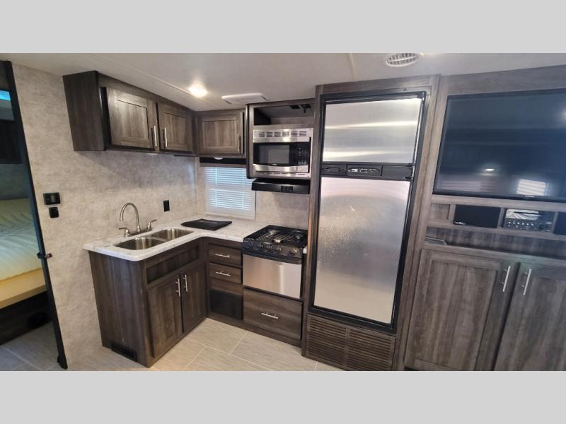 Step inside the main curbside entrance and notice how open and spacious the combined dining and living area is. To the right the kitchen includes a pantry or utilize this space as a wardrobe, refrigerator, three burner range, corner countertop with overhead cabinets for your dishes and things, and a double sink along the interior wall.