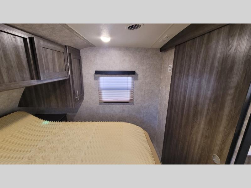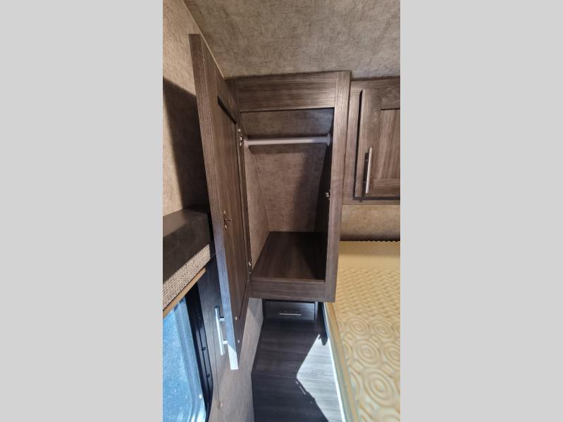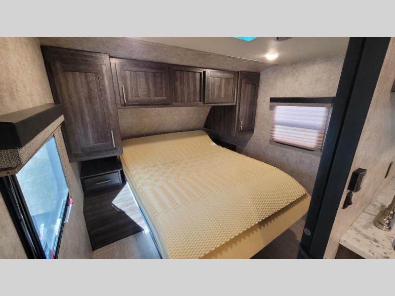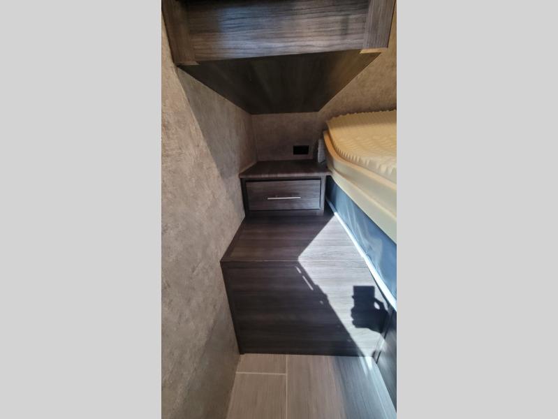 There is a private bedroom in front. Inside the bedroom you will find a convertible queen bed with extension, dual bedside wardrobes and nightstands, plus overhead cabinetry as well.