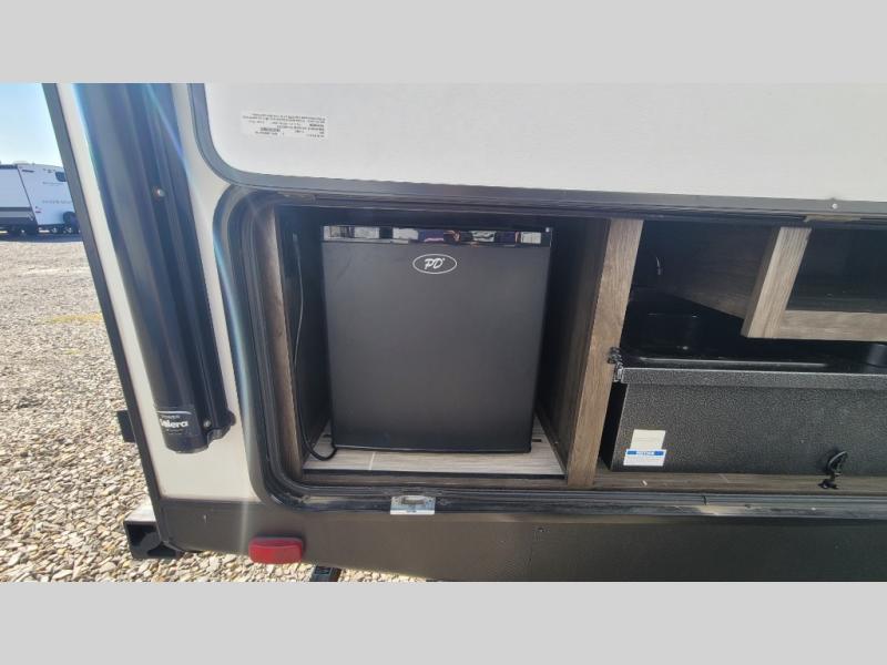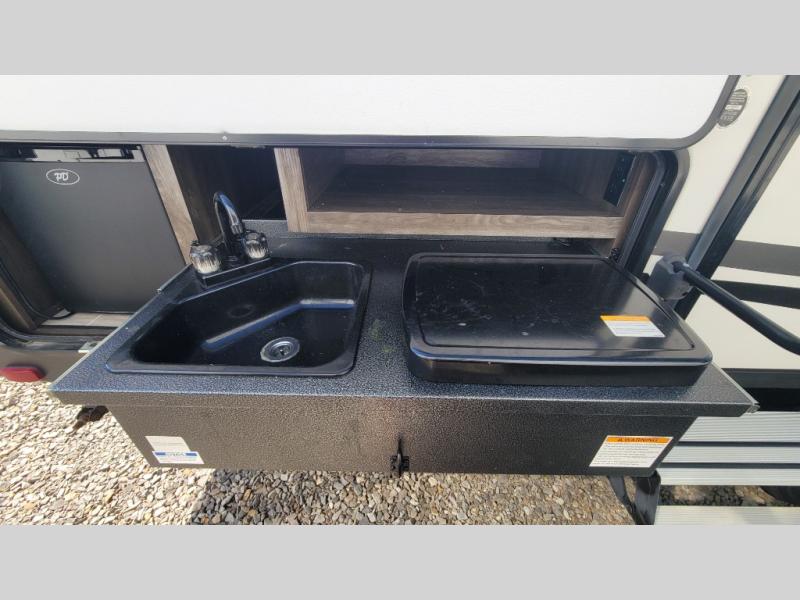 Outside you will find and outdoor kitchen with a sink and two burner cooktop, plus exterior storage for more camping gear, and some!