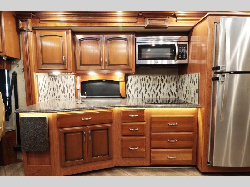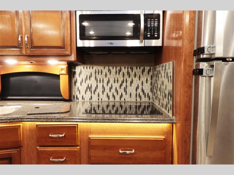 Excellent full-time style amenities: solid hardwood cabinetry, polished solid-surface countertops, wall-to-wall high-gloss (polished) porcelain tile flooring in the living area.