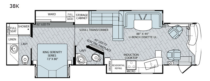 Couples get a large king-bed option (72 × 80 “King Serenity Series”) in the 38K floorplan, offering home-style comfort.