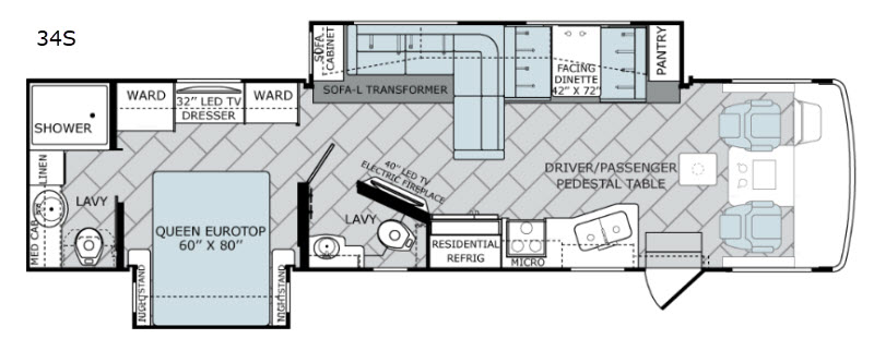 One and a half baths, double slide outs, and many conveniences of home are found in this 34S Vacationer class A gas coach by Holiday Rambler. You can easily enjoy any road trip you find yourself on with the space provided. Enjoy another cup of coffee at the driver/passenger pedestal table. You can relax in the living area. Here you will find a 42" x 72" facing dinette and a L-sofa. Both the sofa and dinette easily convert into additional sleeping space at night. Come watch a little TV at the 40" LED TV or enjoy a fire in the electric fireplace. The master bedroom has a queen Euro Top mattress plus plenty of storage with the two wardrobes and dresser.