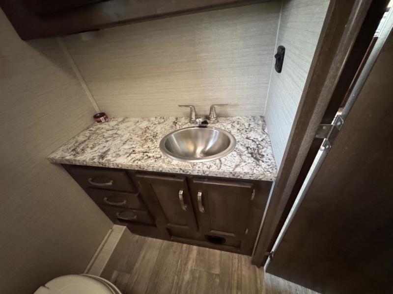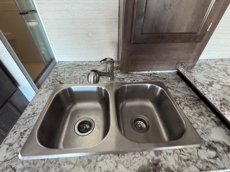 You will easily be able to cook meals and snacks for your family with the kitchen amenities provided. There is an 8 cu. ft. refrigerator or choose a 12 cu. ft. refrigerator, and a pantry to the left of the entry door. Opposite, along the interior wall, you will find a double sink, and a counter which curves around and becomes part of the slide out where you will find a three burner range with overhead microwave oven and storage.