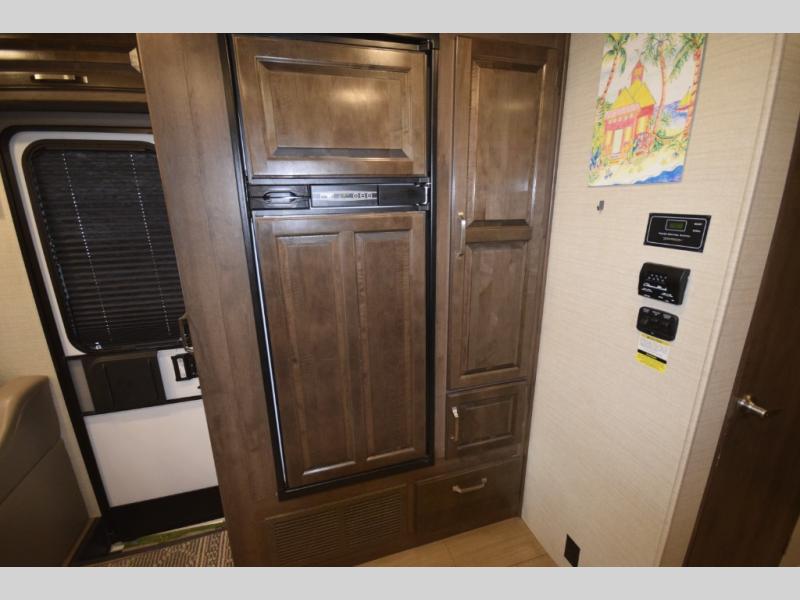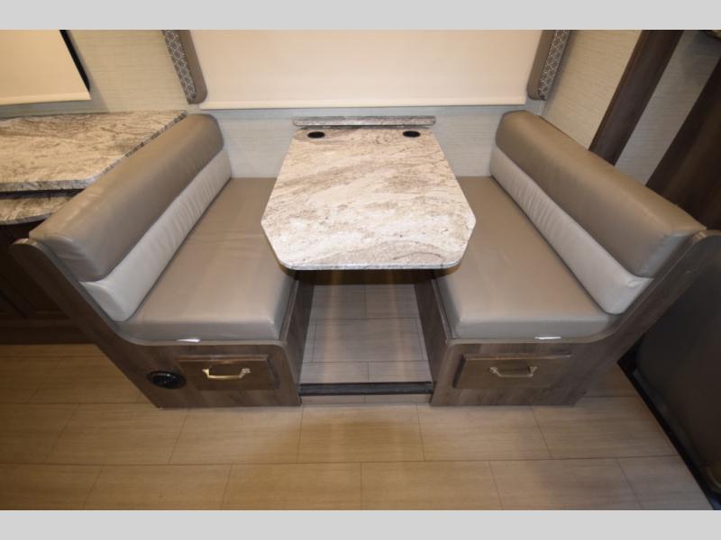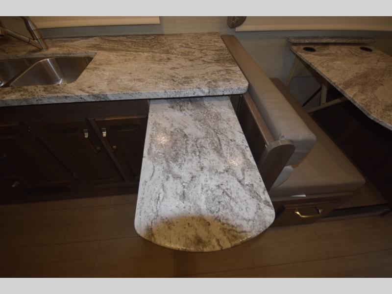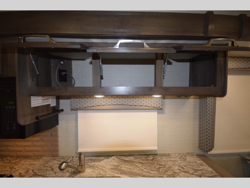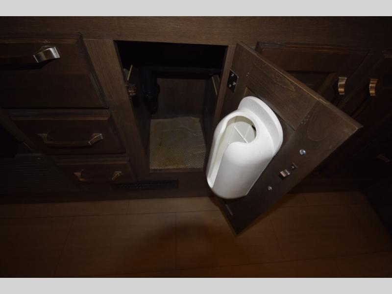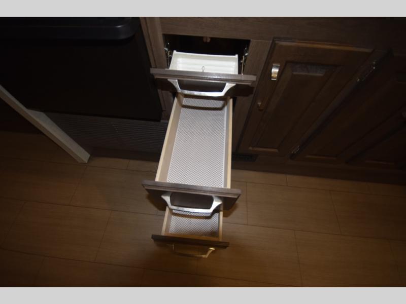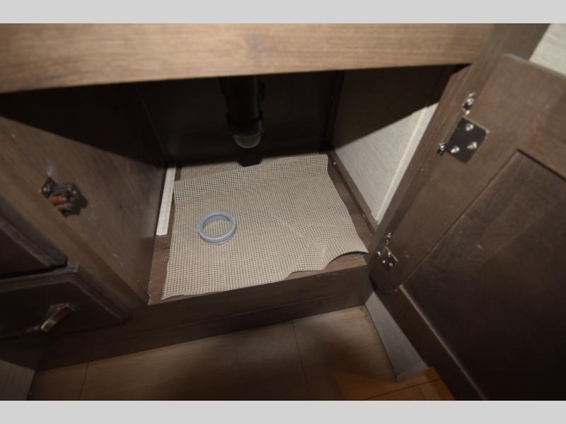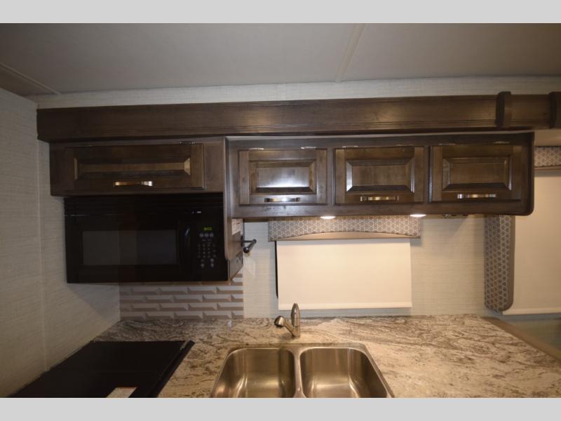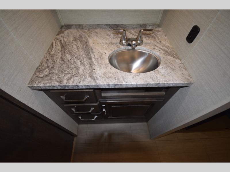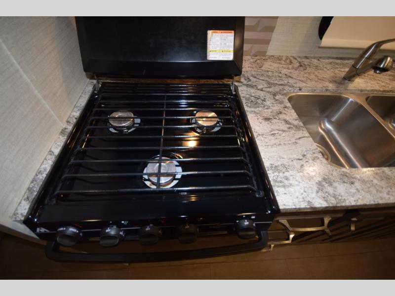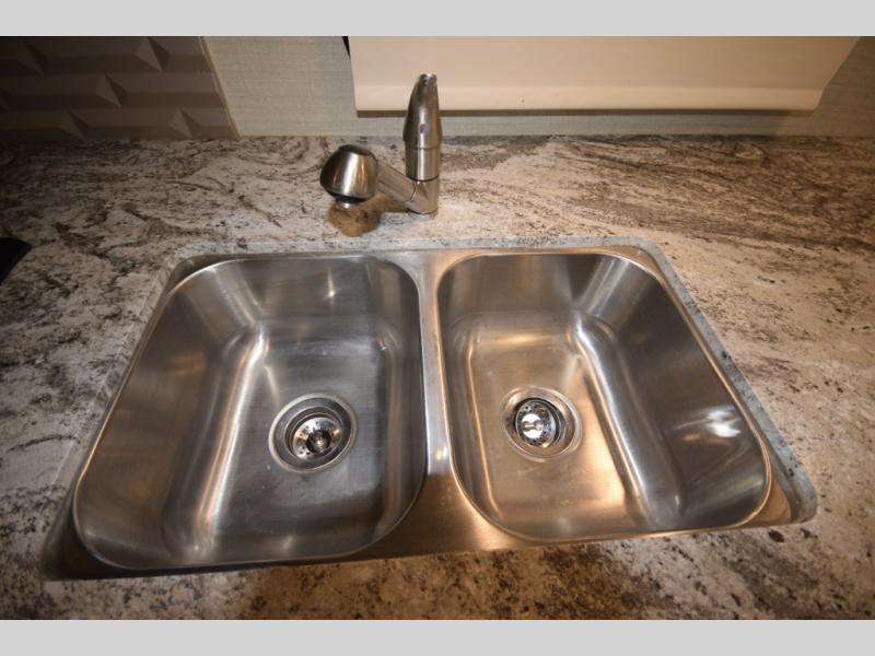Step inside and feel the spaciousness of the full-wall slide-out, opening up the living area for easy movement and comfort. The well-equipped kitchen includes a pull-out countertop for extra prep space, elegant Sienna Maple cabinetry, sleek countertops, and a stainless steel sink—everything you need to prepare delicious meals on the go.