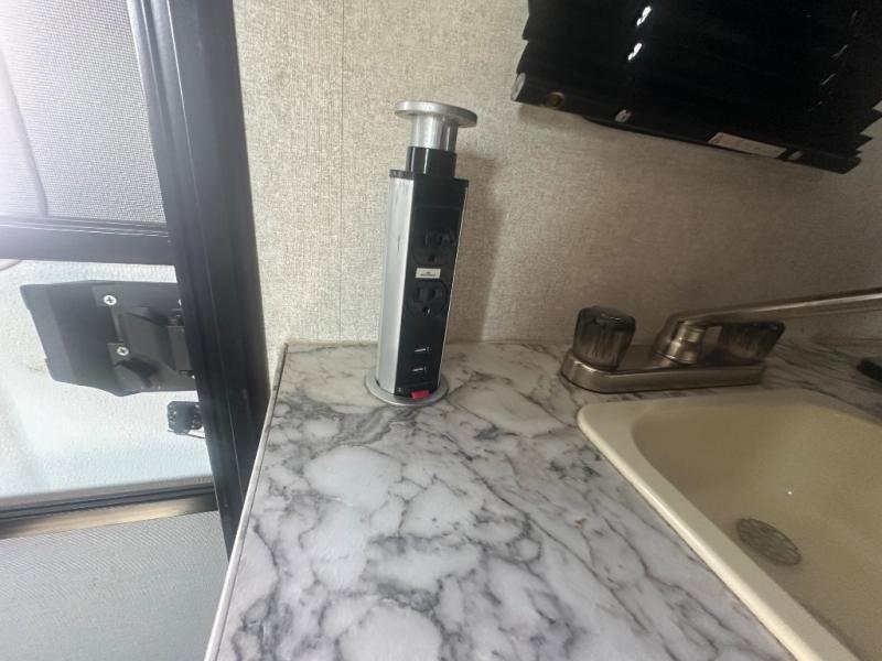 For the couple who enjoys time away from home but prefers the convenience of sleeping in a camper and being able to prepare your meals indoors, then this Hummingbird 16MRB is for you! Depending upon the time of day that you enter this trailer will determine whether you see the sofa along the front wall or the Murphy bed. Many people really enjoy how convenient and "out of the way" the Murphy bed is during the day! Throughout this model there is plenty of storage with the overhead cabinets. Outside you will enjoy the shade from the power awning with LED lights, so now you can enjoy a quiet evening outdoors. Maybe you want a little music, that's not a problem since there are (2) marine grade exterior speakers!