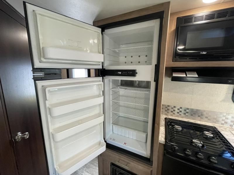 Kitchen equipped with Norcold refrigerator, microwave, and cooktop