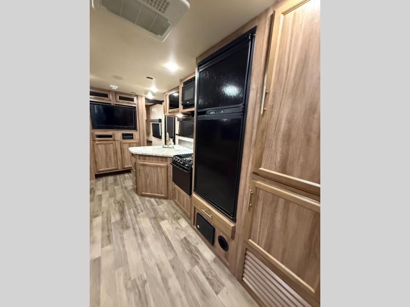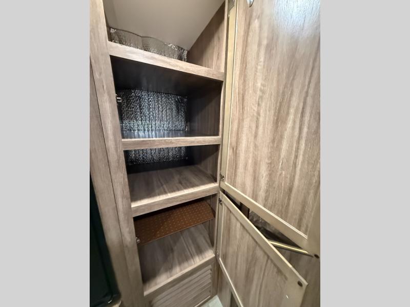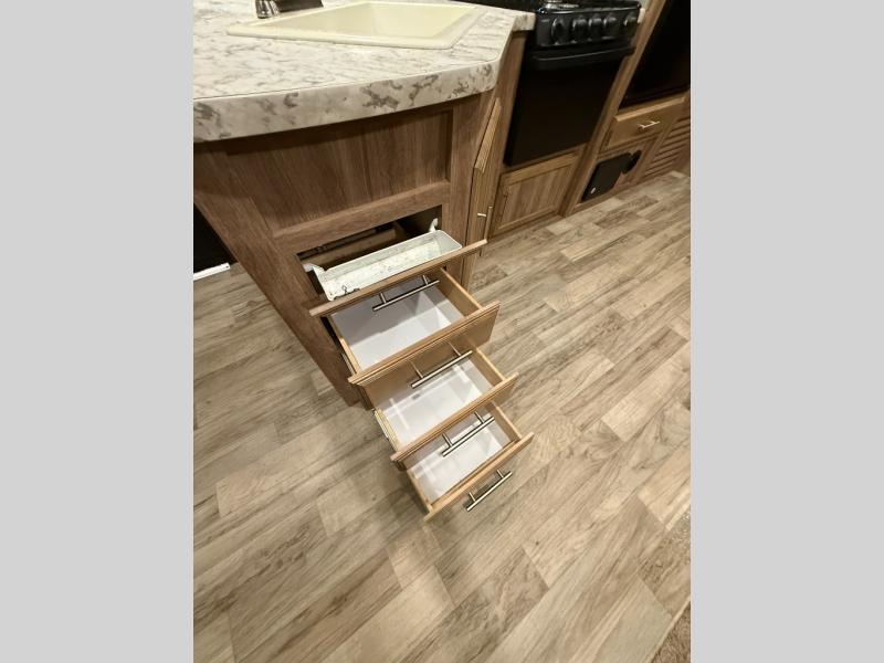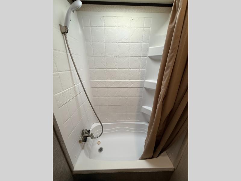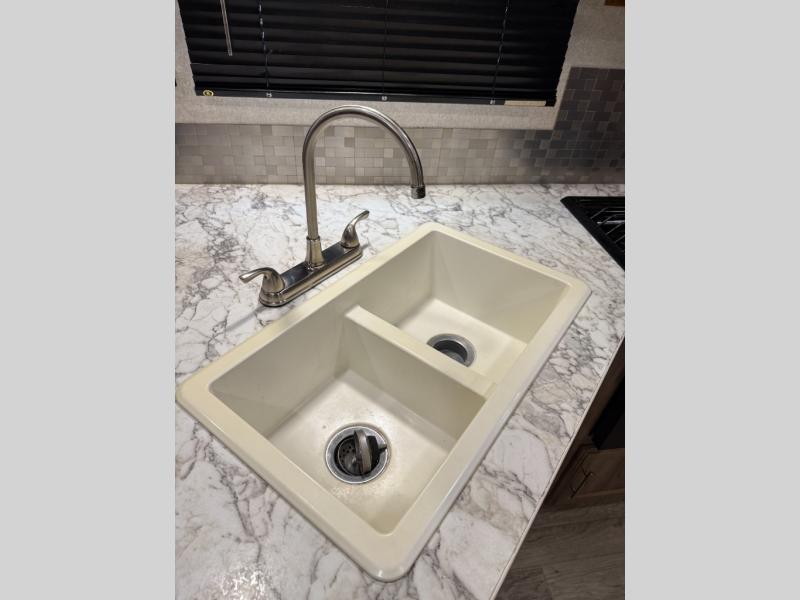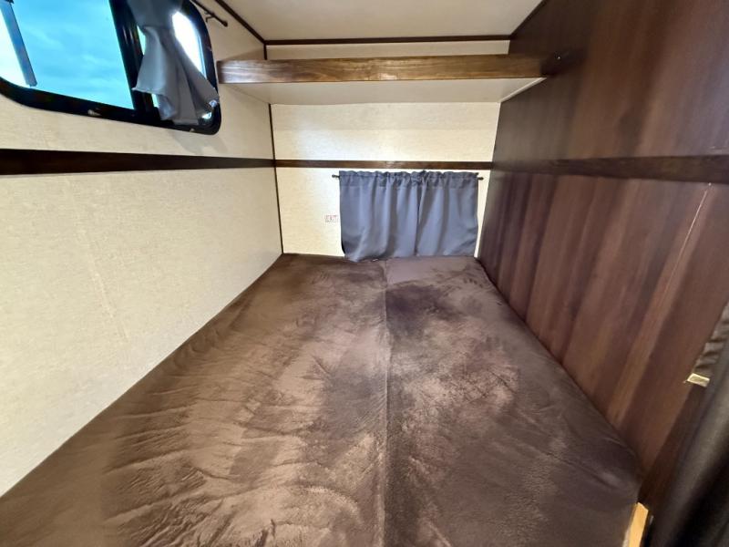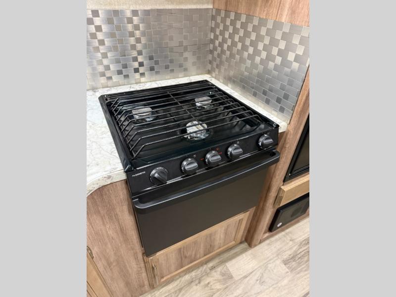 With a set of double bunk beds and other sleeping accommodations at the dinette and sofa plus the front queen Simmons mattress you can easily sleep up to ten people in this Jayco Jay Feather 25BH travel trailer. The slide out along the roadside features a dinette and a sofa, here you can reminisce about your day and at night this area doubles as additional sleeping space. The kitchen features plenty of space plus a large pantry for all of your canned goods. Outside enjoy the shade of the 19' awning plus if you want to grill out then the outside grill propane quick-connect port will come in handy.