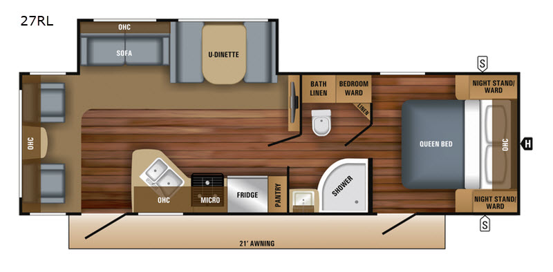 Come see just how fun camping can be with this lightweight travel trailer by Jayco. This Jay Feather 27RL has two entry doors - one in the rear which leads to the living area and one in the front that leads into the front bedroom. In the bedroom you will also find a queen bed with a Jayco exclusive Simmons mattress. A walk-through bathroom offers easy access from either the bedroom or from the living area. You can easily entertain a guest or two in the rear living area. Seating can be found at the two lounge chairs along the rear wall or at the slide out which features a sofa or dinette. Outside enjoy the shade of the 21' awning plus the LED lights allow you to continue your party just a little bit longer.