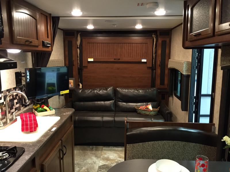 What I liked most: The TV position in this small travel trailer is excellent. You can swivel and position it to see from just about anywhere in the couch, dining, kitchen area. The front bed drops down and folds up out-of-the-way. Bunkbed area has two nice sized double bunks. The sink being outside the bathroom is a nice touch.