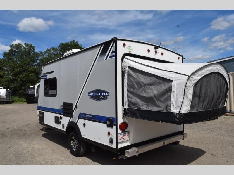 When you choose a Jay Feather expandable you can rest assured that you have chosen quality construction with features such as an aerodynamic, rounded front profile with front diamond plate plus there are vacuum-bonded, laminated bed platforms with reverse-cambered support of 1,100-lb. capacity, plus water-repellent, scratch-resistant Jayco DuraTek vinyl tent material with zipper windows. Inside you will find crown molding with wood batten strips along the ceiling, LED lighting throughout, and ball-bearing drawer glides with a 75-lb. capacity. The mandatory Customer Value Package includes features such as a spare tire and cover, power awning, outside shower, plus AM/FM/CD/DVD/Bluetooth stereo and more! For your next camping trip, come choose a Jay Feather expandable!