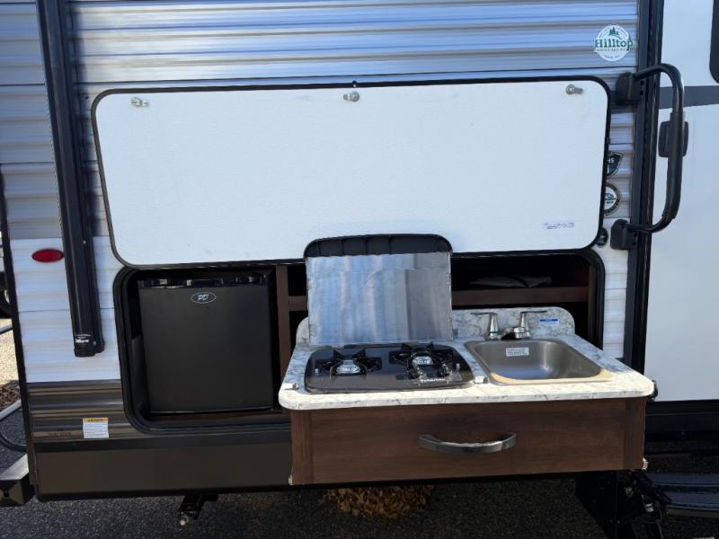 It's time to enjoy all your camping trips with your family in this Jay Flight 28BHS travel trailer. The kiddos will enjoy their own double bunk beds while you rest in the master bedroom on the opposite side. You can meet in the middle to play games and eat meals together on the U-shaped dinette or sofa. The rear bathroom is conveniently beside the bunks, as well as the main entry door. The second entry in the master bedroom allows the parents to sneak out for a walk in the morning while the others sleep after staying up late. If you want to start breakfast outside on the outdoor kitchen, that works also. It's time to start planning your next trip!