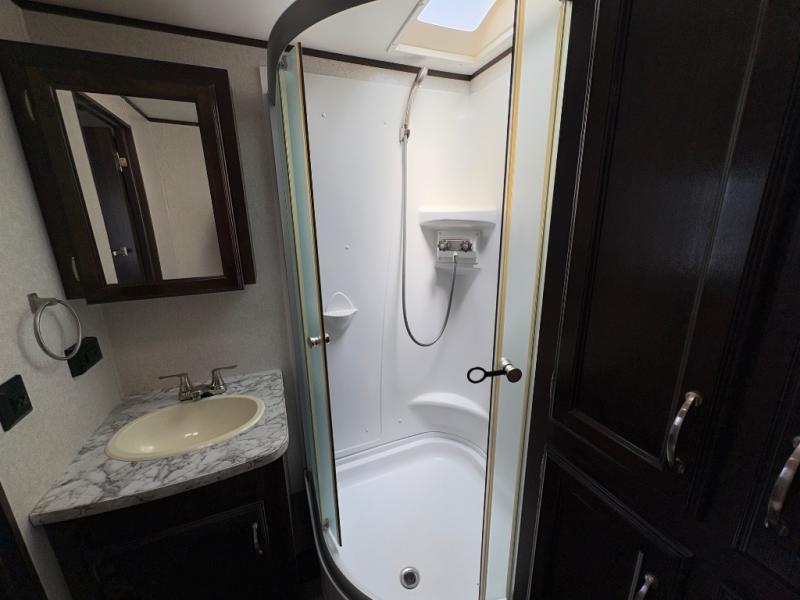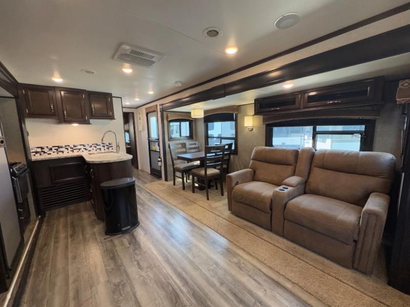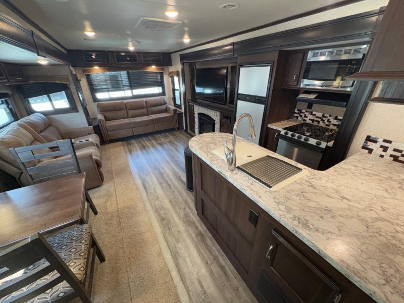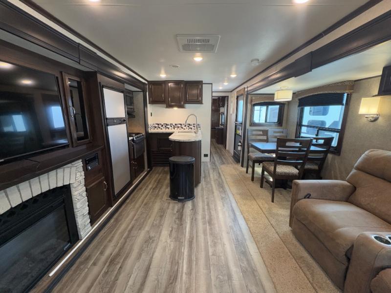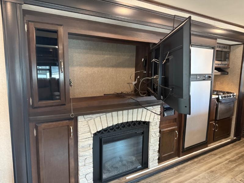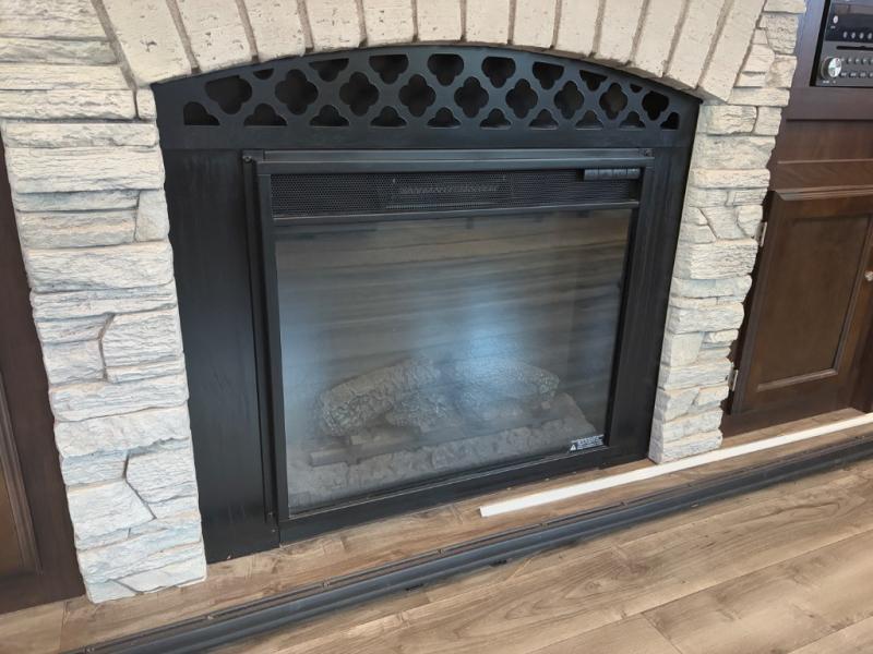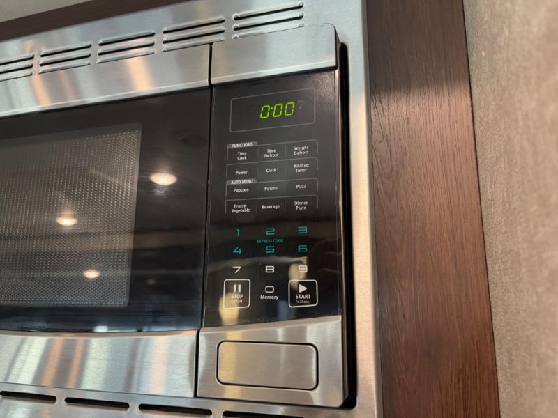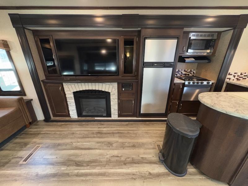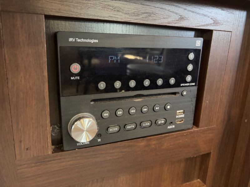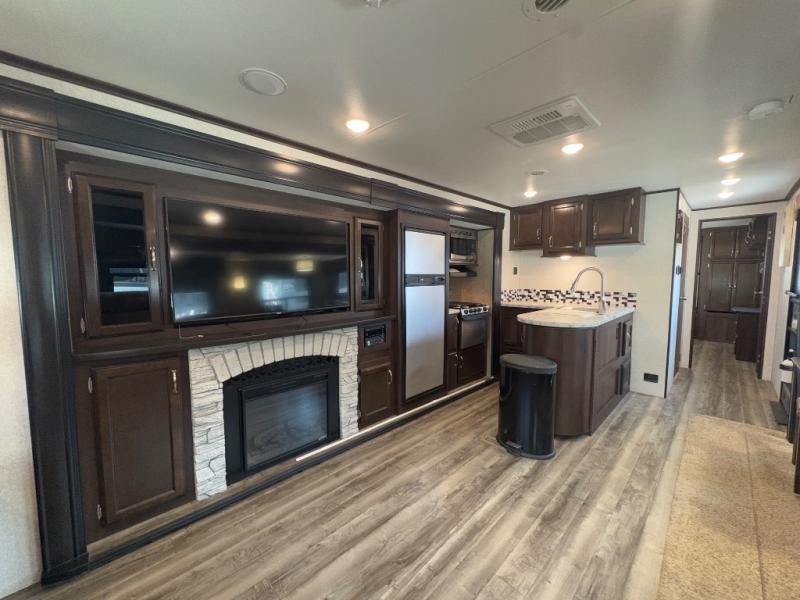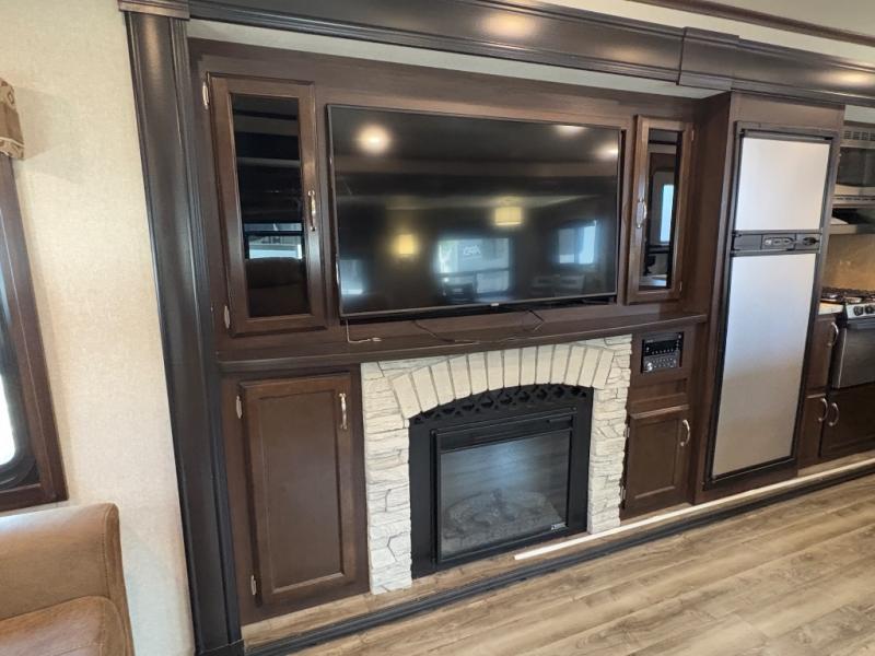 What I liked most: Triple slide creates a lot of space in the kitchen living dining area. Two recliners plus the couch is a lot of seating. Built in entertainment area with fireplace. The television is setup behind a cabinet door border that opens and reveals extra storage space. Bathroom has two door entry. Lots of storage in the bathroom. Bedroom feels very open with double slide closet mirror and plenty of storage. A pretty neat digital device charging center as well.