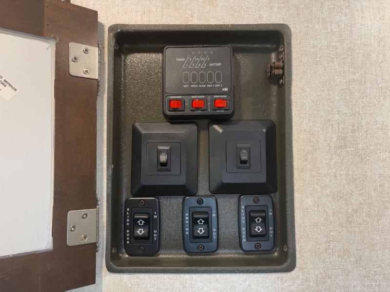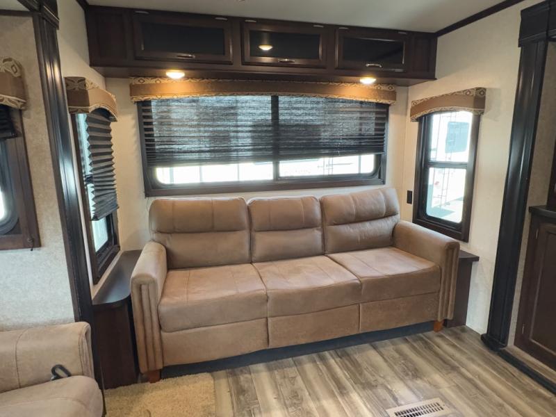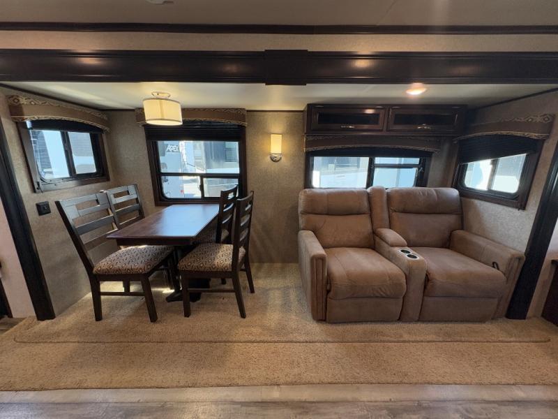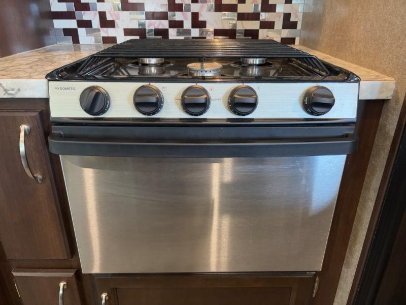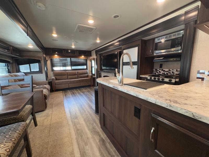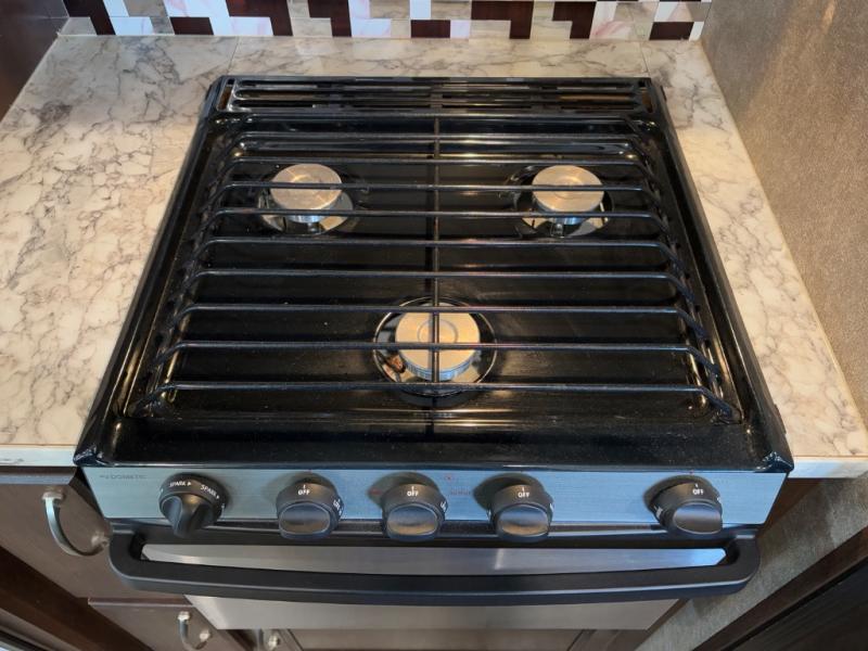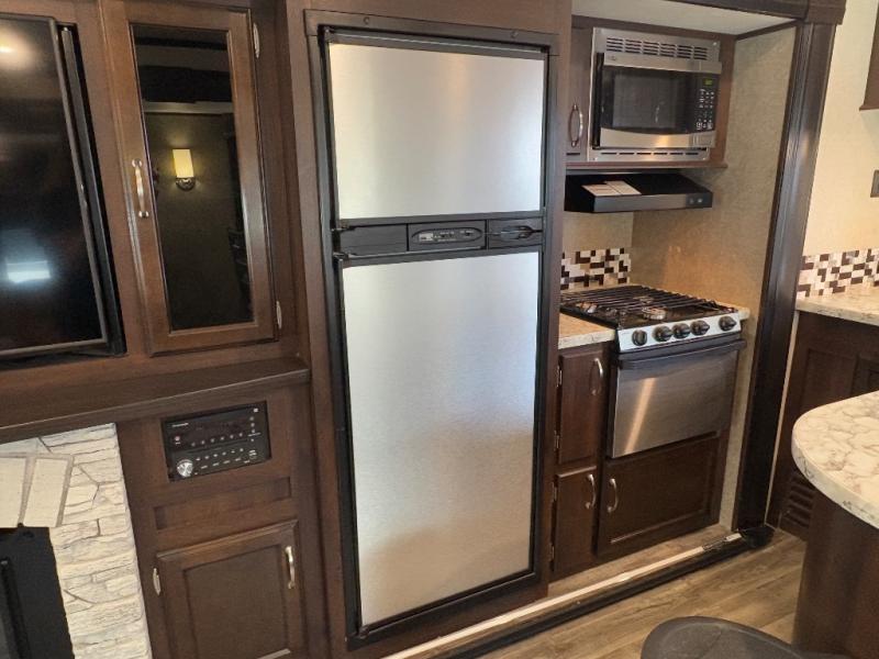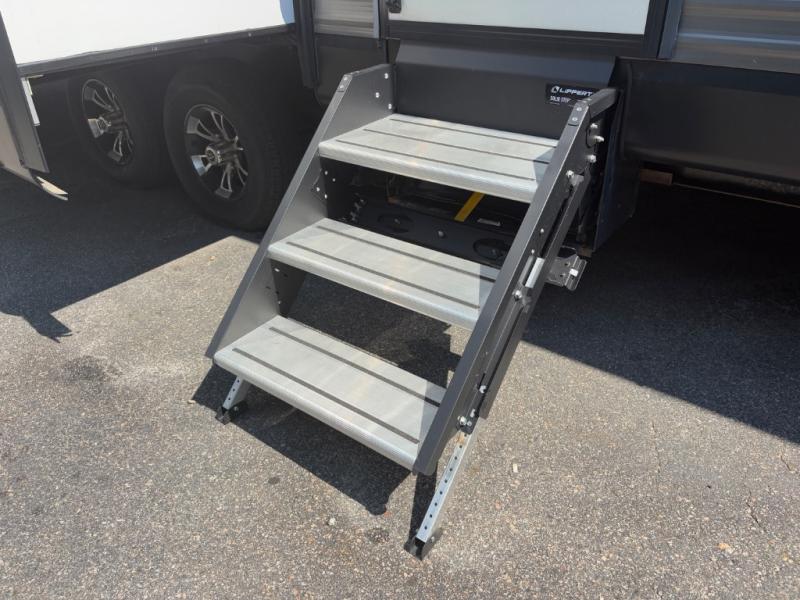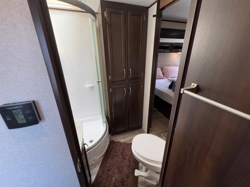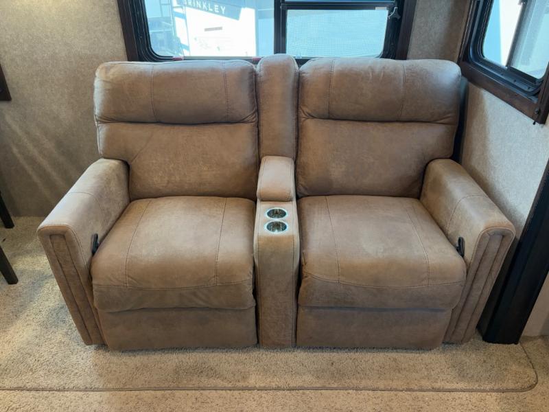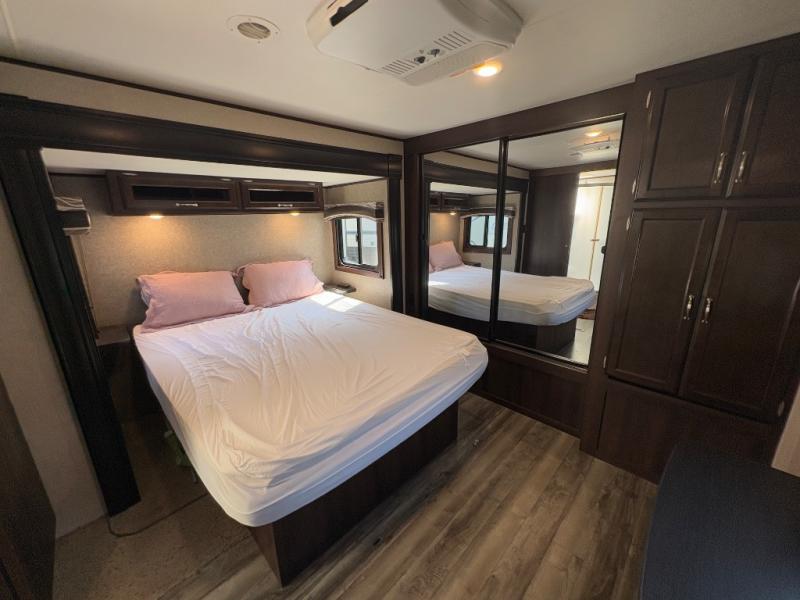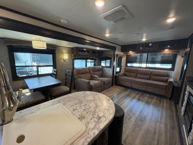 What I liked most: Triple slide creates a lot of space in the kitchen living dining area. Two recliners plus the couch is a lot of seating. Built in entertainment area with fireplace. The television is setup behind a cabinet door border that opens and reveals extra storage space. Bathroom has two door entry. Lots of storage in the bathroom. Bedroom feels very open with double slide closet mirror and plenty of storage. A pretty neat digital device charging center as well.