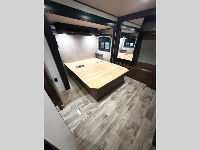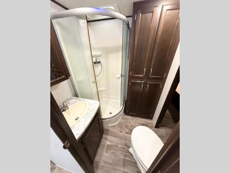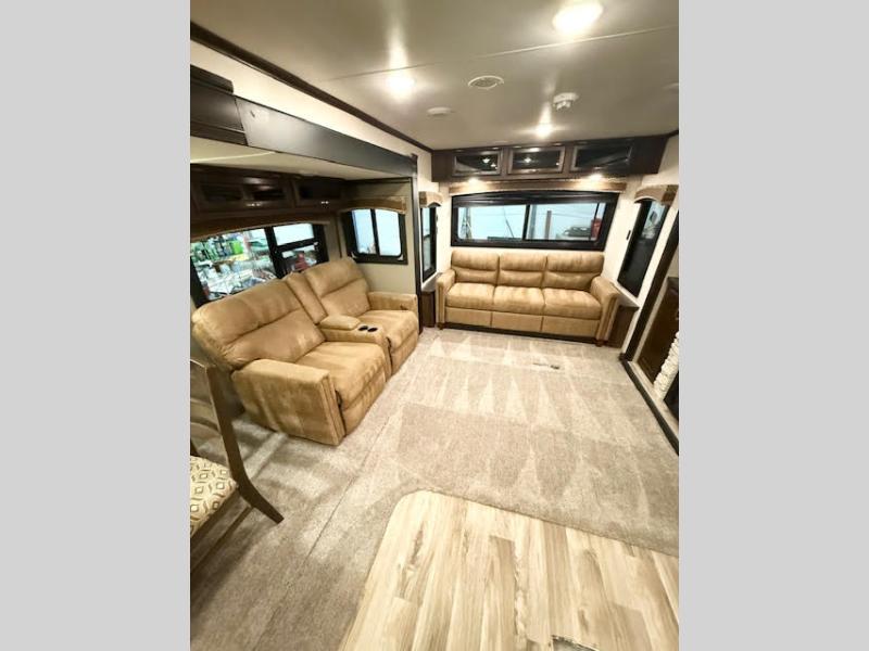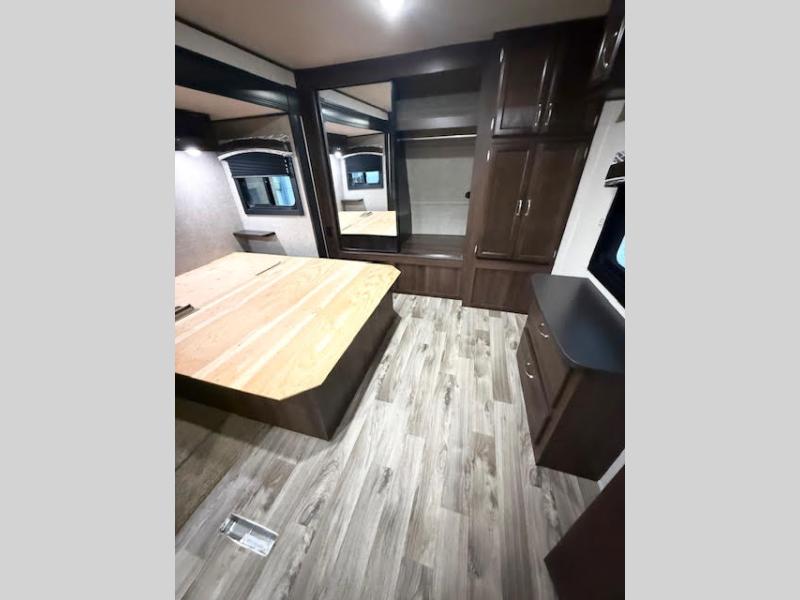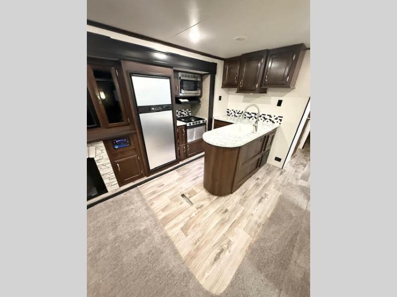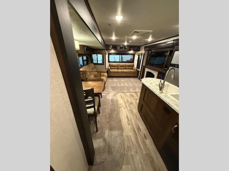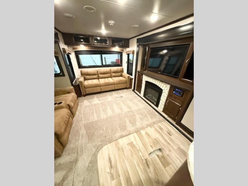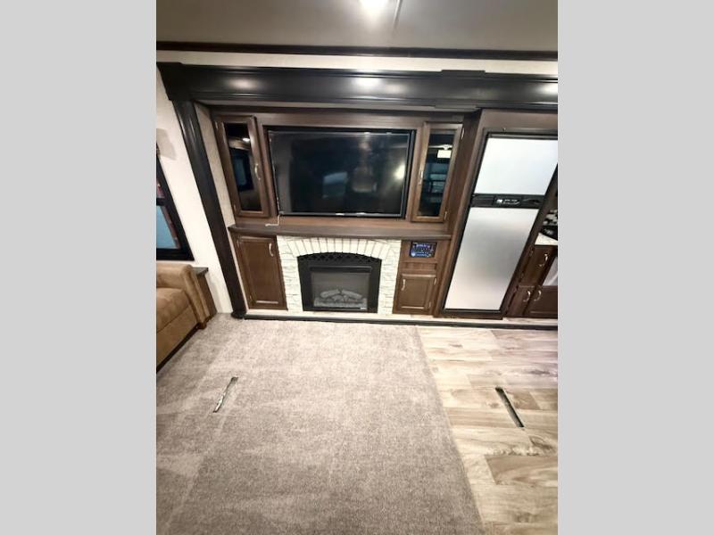 What I liked most: Triple slide creates a lot of space in the kitchen living dining area. Two recliners plus the couch is a lot of seating. Built in entertainment area with fireplace. The television is setup behind a cabinet door border that opens and reveals extra storage space. Bathroom has two door entry. Lots of storage in the bathroom. Bedroom feels very open with double slide closet mirror and plenty of storage. A pretty neat digital device charging center as well.